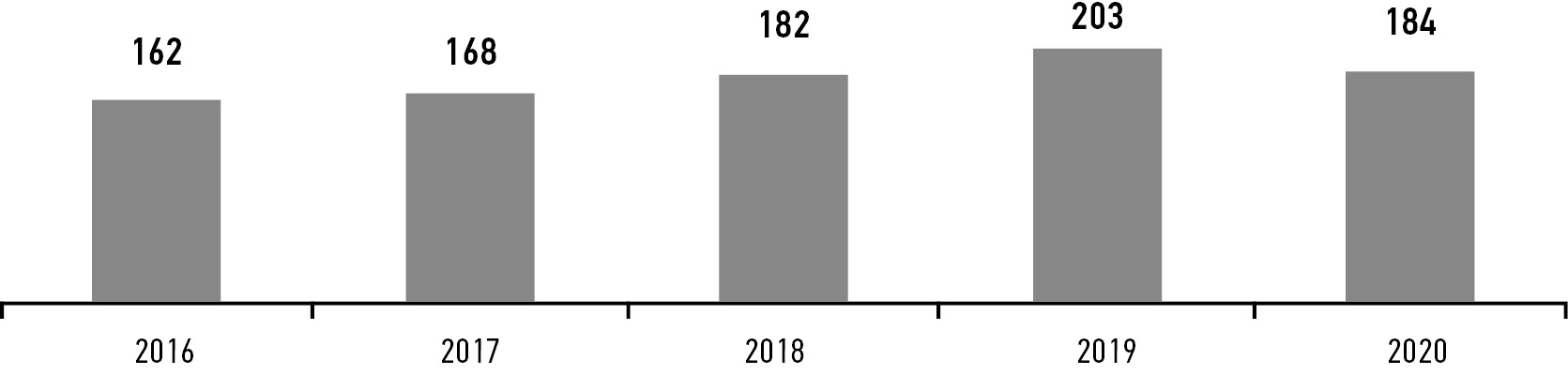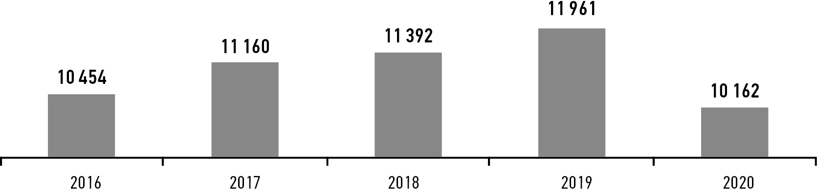 Рис. 2. Динамика впервые выявленных случаев злокачественной меланомы кожи в 2016–2020 гг. в России.