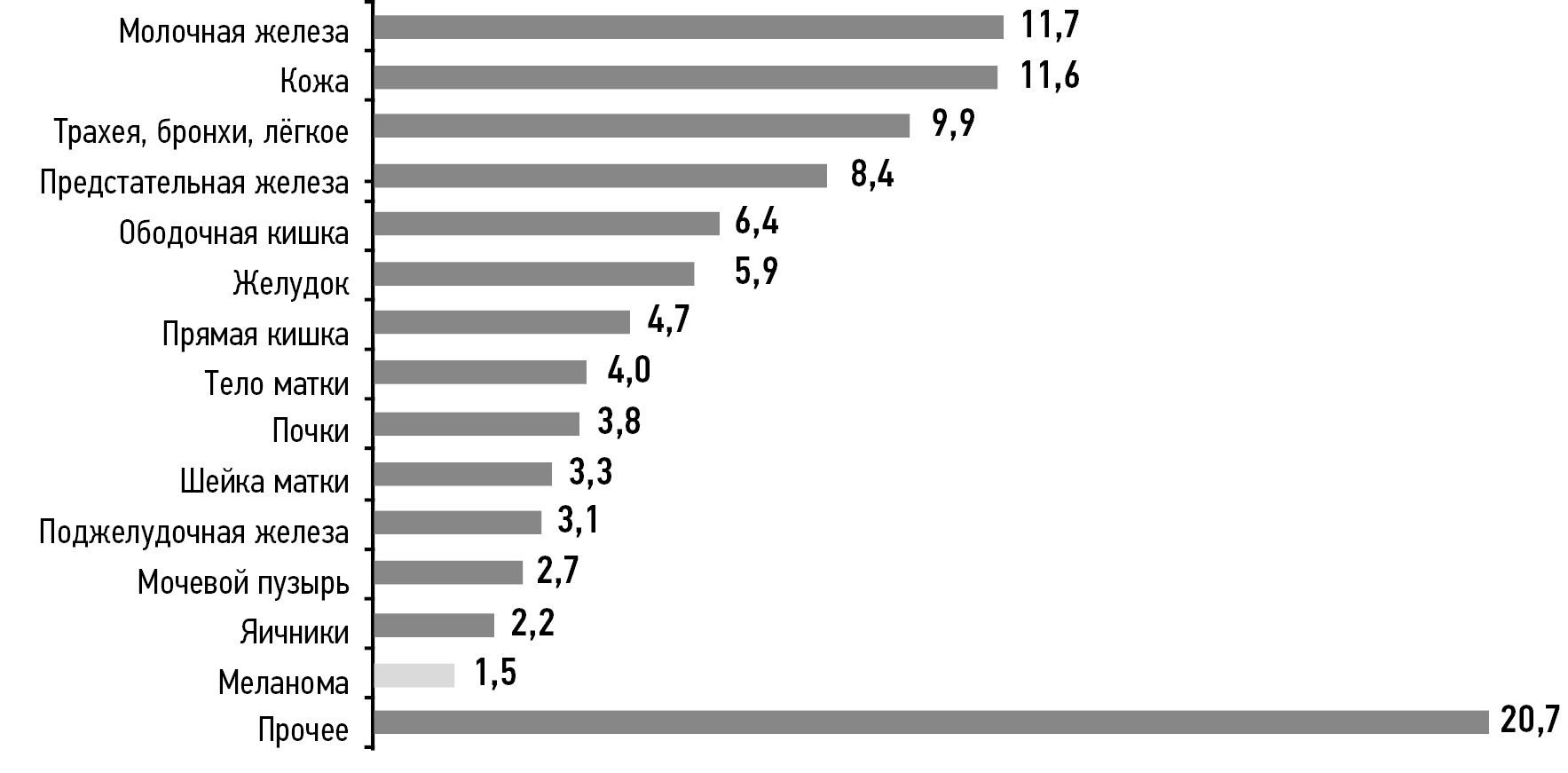 В Красноярском крае в 2020 г. в структуре общей заболеваемости ЗНО меланома кожи среди обоих полов находится на 14-м месте – 1,5%. Лидирующие позиции занимают следующие ЗНО (в %): молочной железы – 11,7; кожи (кроме меланомы) – 11,6; трахеи, бронхов и лёгкого – 9,9 (рис. 3). В структуре заболеваемости мужского населения региона меланома занимает 14-е место (1,7%), у женщин – 15-е (1,3%). В России злокачественная меланома кожи занимает 12-ю позицию в общей структуре заболеваемости ЗНО (2%) [2].