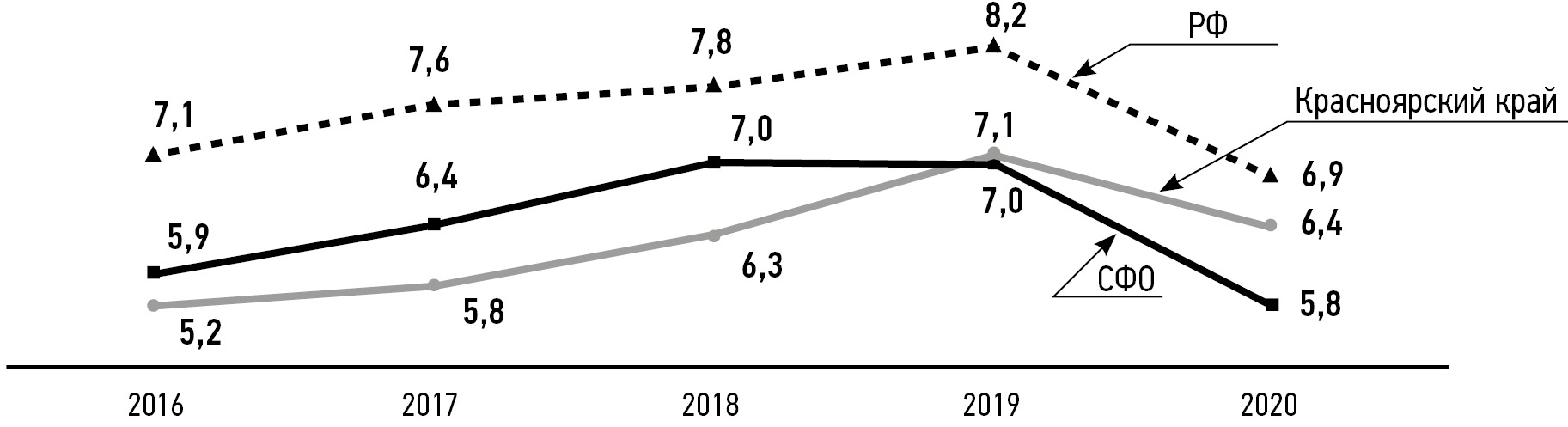 Показатель заболеваемости меланомой кожи в Красноярском крае в 2020 г. по сравнению с 2016 г. вырос на 14,3% (с 5,6 до 6,4 на 100 тыс. населения), но оставался ниже показателя в РФ на протяжении всего анализируемого периода. Максимальный показатель в Красноярском крае за период с 2016 по 2020 г. (7,1 случая на 100 тыс. населения) зафиксирован в 2019 г. и превысил на 1,4% аналогичный показатель в Сибирском федеральном округе (7 на 100 тыс. населения), а в 2020 г. превышение составило уже 14,3% (6,4 против 5,6 на 100 тыс. населения в 2016 г.) (рис. 4).