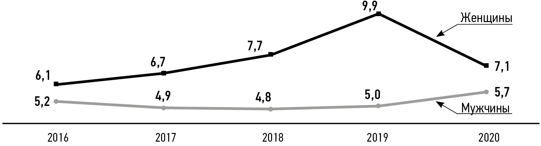 Рис. 5. Динамика заболеваемости злокачественной меланомой кожи среди мужского и женского населения в Красноярском крае в 2016–2020 гг., на 100 тыс. соответствующего населения.