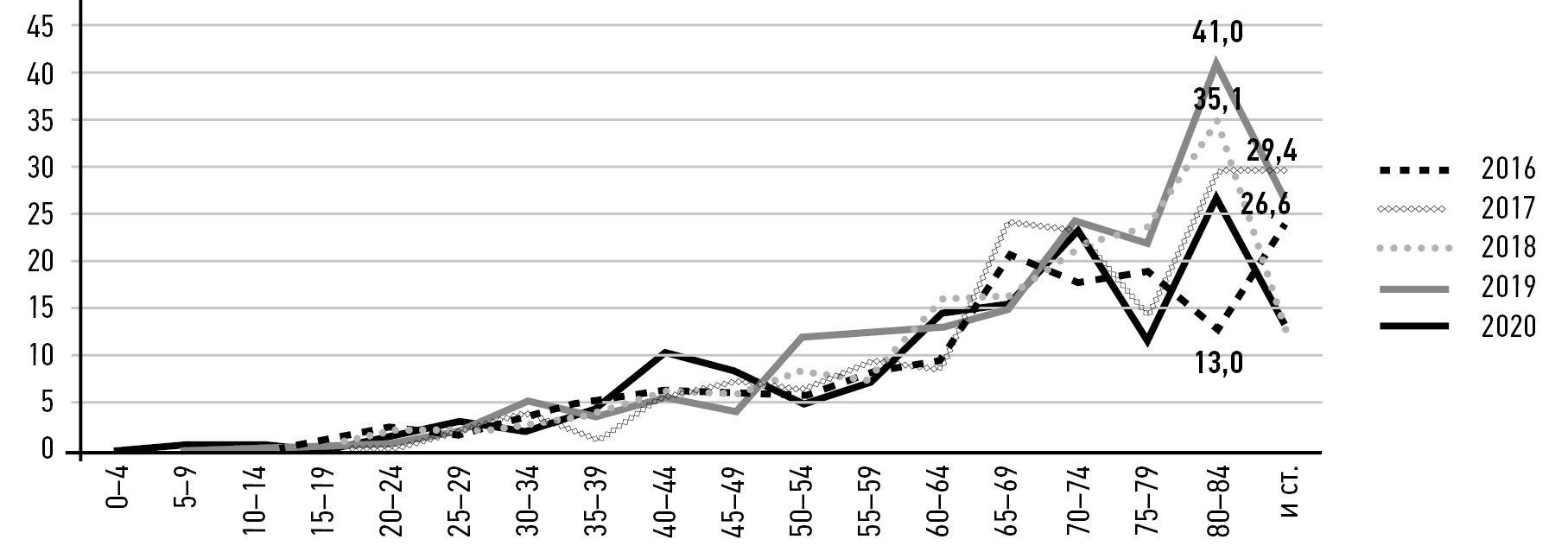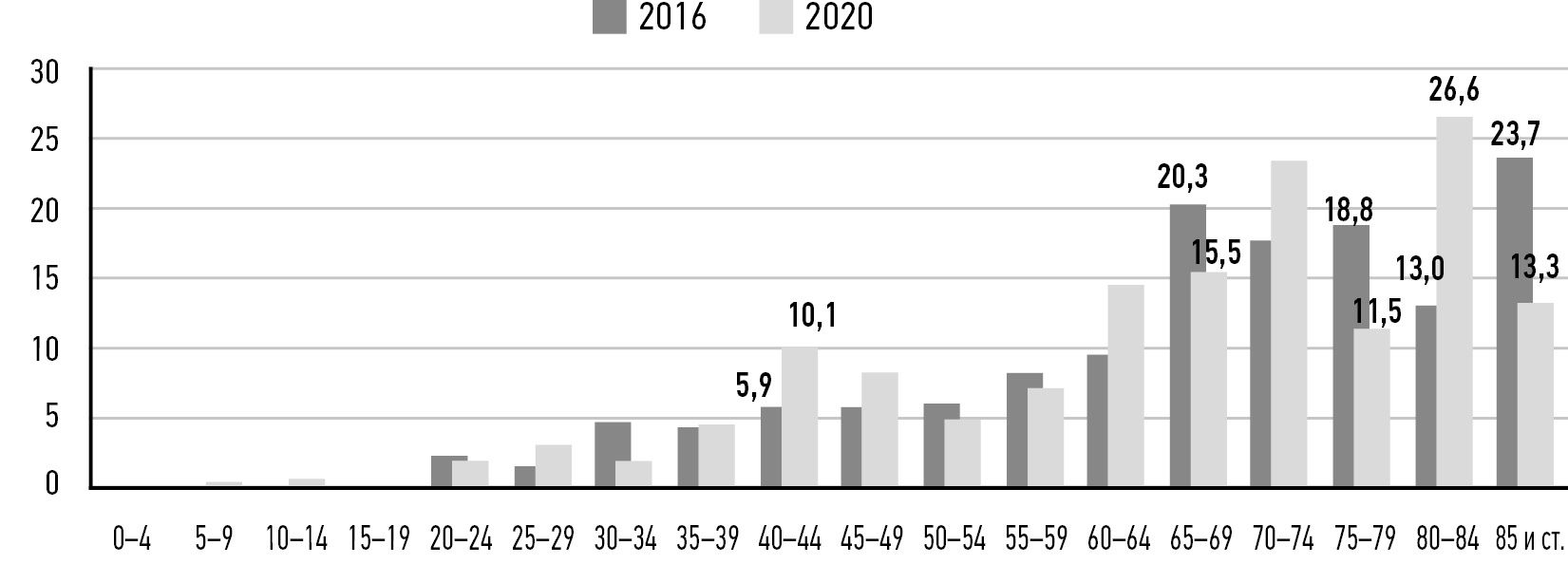 Для сравнения: в РФ в указанный период времени наибольший прирост заболеваемости выявлен в двух возрастных группах: 70–74 года – с 21,6 до 22,8 на 100 тыс. населения, 75–79 лет – с 23,5 до 24,7 на 100 тыс. населения. Снижение заболеваемости (на 100 тыс. населения) наблюдается в следующих возрастных группах: 65–69 лет – с 20,9 (2016 г.) до 16,7 (2020 г.), 80–84 года (с 24,2 до 22,2 соответственно).