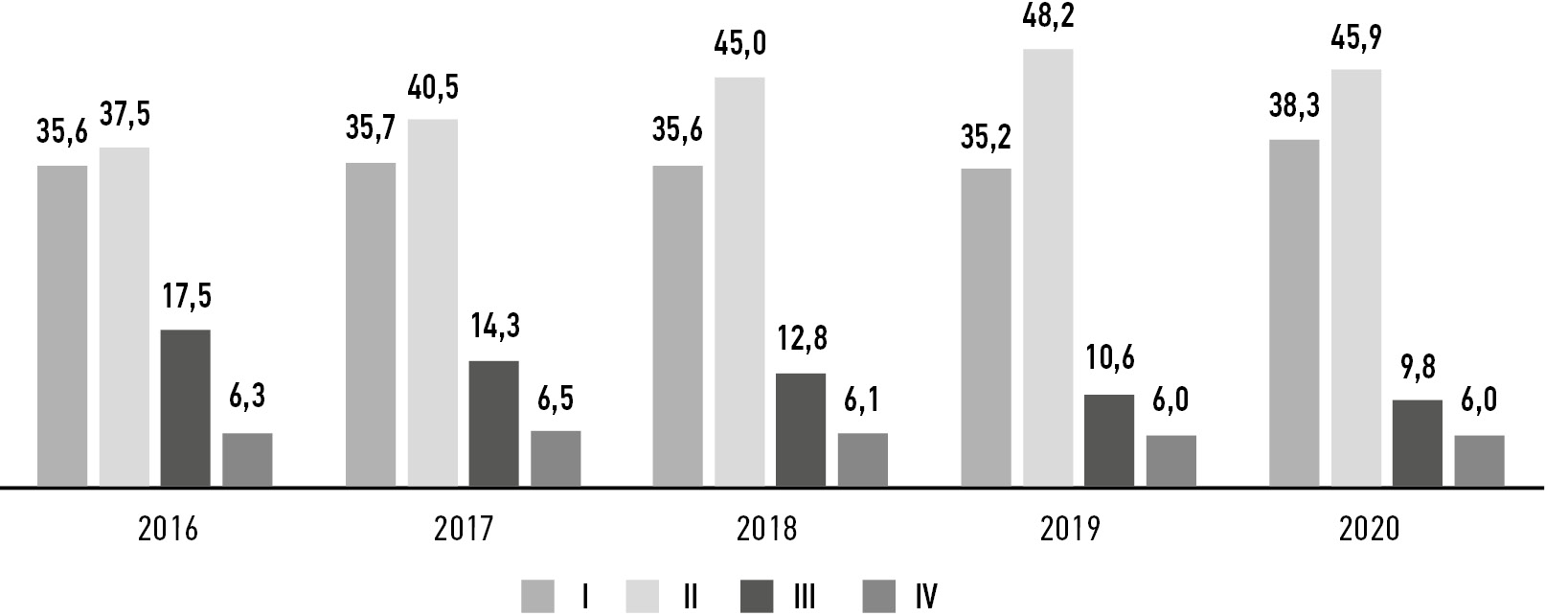 В Красноярском крае выявление злокачественной меланомы кожи за период 2016–2020 гг. увеличилось: на I–II стадиях – на 15,2%, в том числе на I стадии – на 7,6%; на II стадии – на 22,4%. Показатель запущенности при меланоме снизился на 33,6% в 2020 г. по сравнению с 2016 г.: с 23,8% до 15,8%, в основном за счет снижения случаев, выявленных на III стадии опухолевого процесса – на 7,7% (с 17,5% в 2016 г. до 9,8% в 2020 г.). Снижение доли IV стадии составило 4,8% (с 6,3% в 2016 г. до 6% в 2020 г.). Отметим, что в 2019 и 2020 гг. стадия злокачественного процесса была установлена в 100% случаев, т.е. не было случаев с неустановленной стадией заболевания (рис. 8).