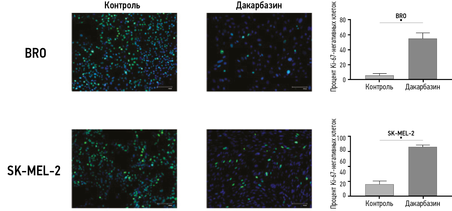 По результатам иммуноцитохимического исследования с маркером клеточной пролиферации Ki-67 и DAPI (рис. 1) было выявлено увеличение доли G0-положительных (Ki-67 негативных) клеток под воздействием цитостатического препарата дакарбазин в 8,8 раза в клеточной линии BRO и в 2,5 раза — в клеточной линии SK-MEL-2.