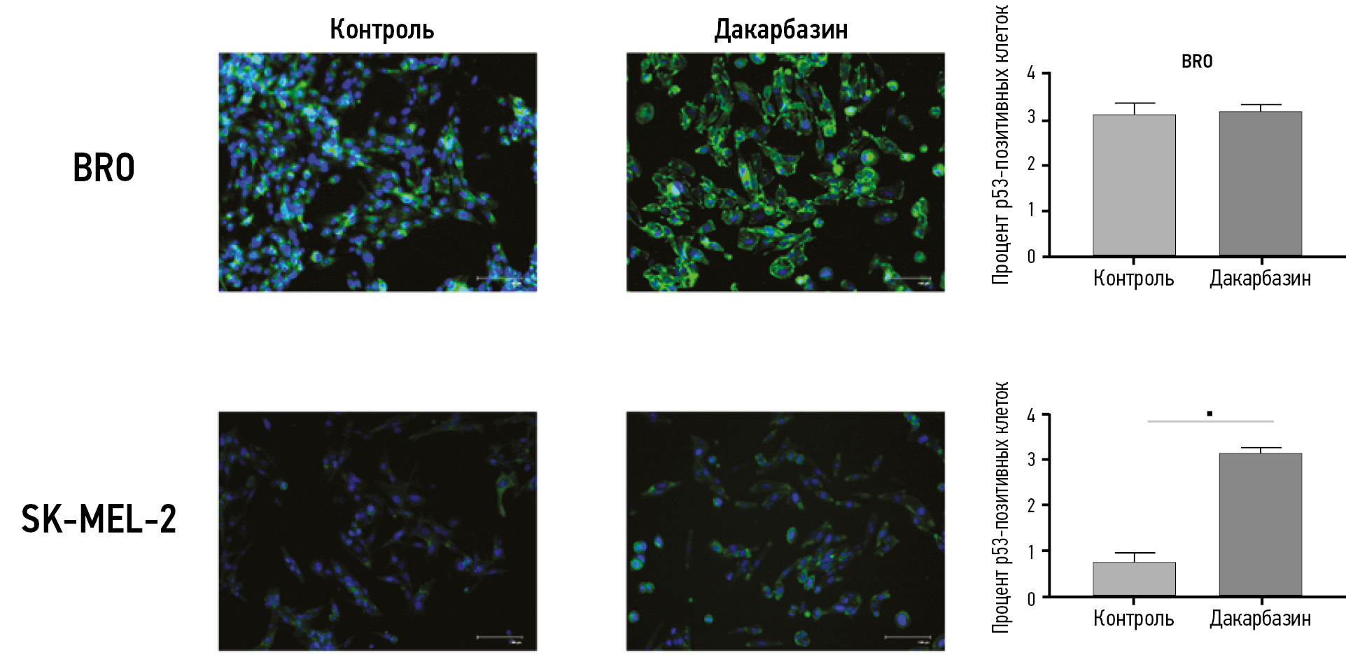 Опухолевый супрессор p53 экспресcировался в клеточных линиях BRO и SK-MEL-2 по данным иммуноцитохимического окрашивания с антителами p53 и DAPI (рис. 2), что свидетельствует об отсутствии мутаций в гене TP53, кодирующем белок p53. Под воздействием алкилирующего агента дакарбазина не наблюдалось статистически значимого изменения экспрессии p53 в клетках меланомы BRO. В клеточной линии SK-MEL-2 уровень белка p53 увеличивался на 12,5% (р=0,049), что свидетельствует о повышении экспрессии данного белка.