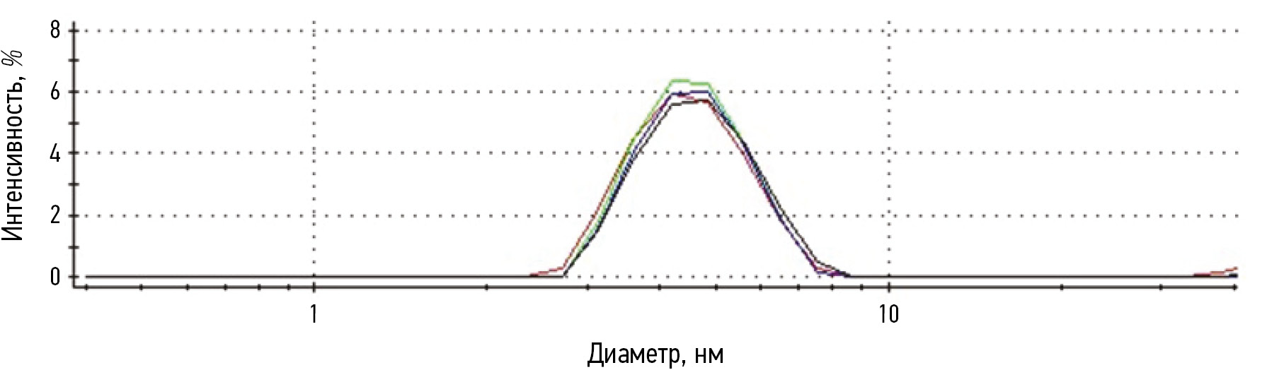 Вычисление размера наночастиц проводили методом динамического светорассеяния. Интенсивность динамического светорассеяния определяли с помощью анализатора размера частиц и дзета-потенциала Zetasizer Nano ZC (Malvern Panalytical, Великобритания) за четыре повтора длительностью по 60 с каждый.