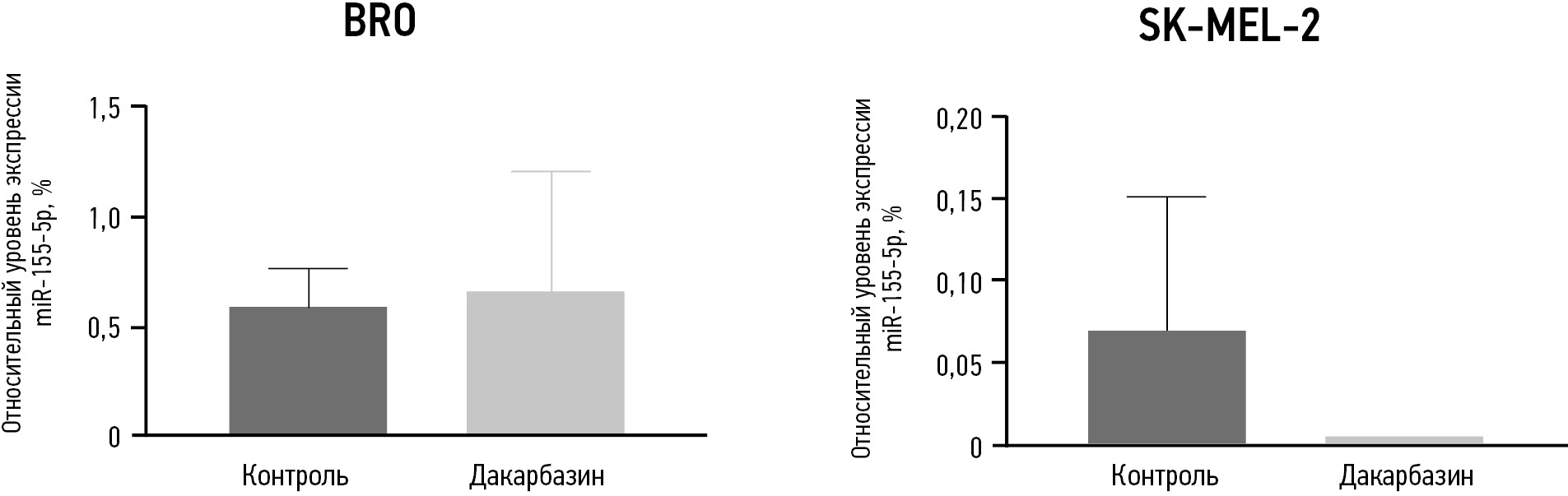 Цитостатический препарат дакарбазин оказывал различное действие на клеточные линии меланомы кожи BRO и SK-MEL-2. Данные результаты можно связать с феноменом клеточной гетерогенности опухоли. Активация синтеза экзосомальной микроРНК говорит об усиленной секреторной активности клеток после повышения в них доли G0-положительных клеток, характерной для SASP-фенотипа опухоли. Инициация стареющего фенотипа происходит в результате ингибирования онко-микроРНК miR-155-5p. Так, в клетках меланомы SK-MEL-2 под действием дакарбазина происходит снижение активации онкогенеза и формирование фенотипа стареющих клеток за счёт miR-155-опосредуемого увеличения экспрессии опухолевого супрессора p53. Небольшой процент увеличения экспрессии p53 может свидетельствовать о том, что клеточная линия BRO имеет другие, более сложные механизмы защиты от воздействия противоопухолевого препарата и более прогрессивное течение заболевания, которое требует дальнейшего детального изучения.