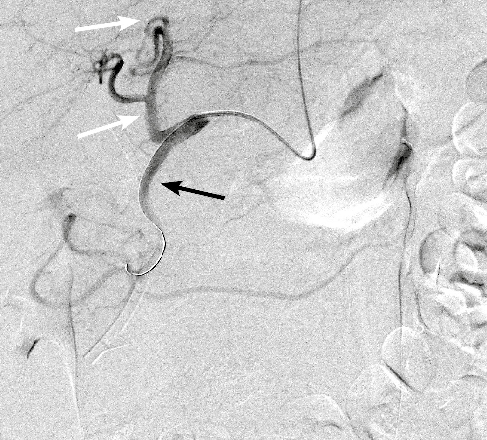 Рис. 1. Ангиограмма общей печёночной артерии: левая печёночная артерия (белая стрелка) и гастродуоденальная артерия (чёрная стрелка).