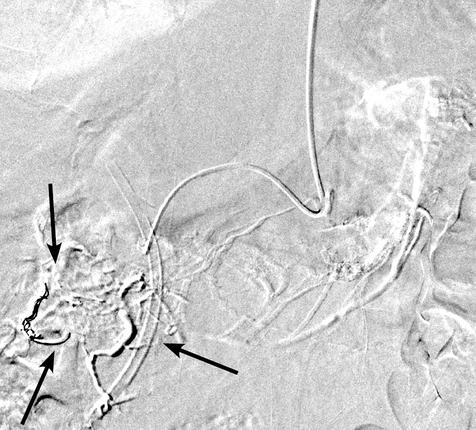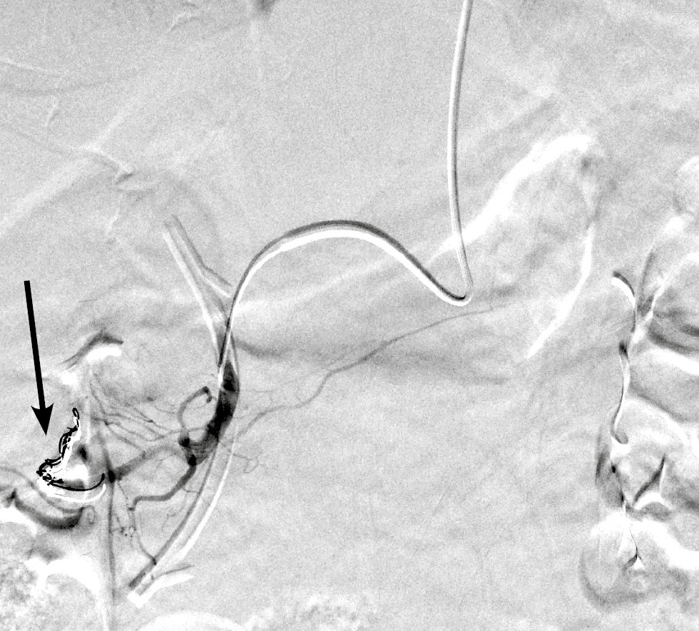 Рис. 2. Ангиограмма правой желудочно-сальниковой артерии, выполненная через микрокатетер (чёрная стрелка).