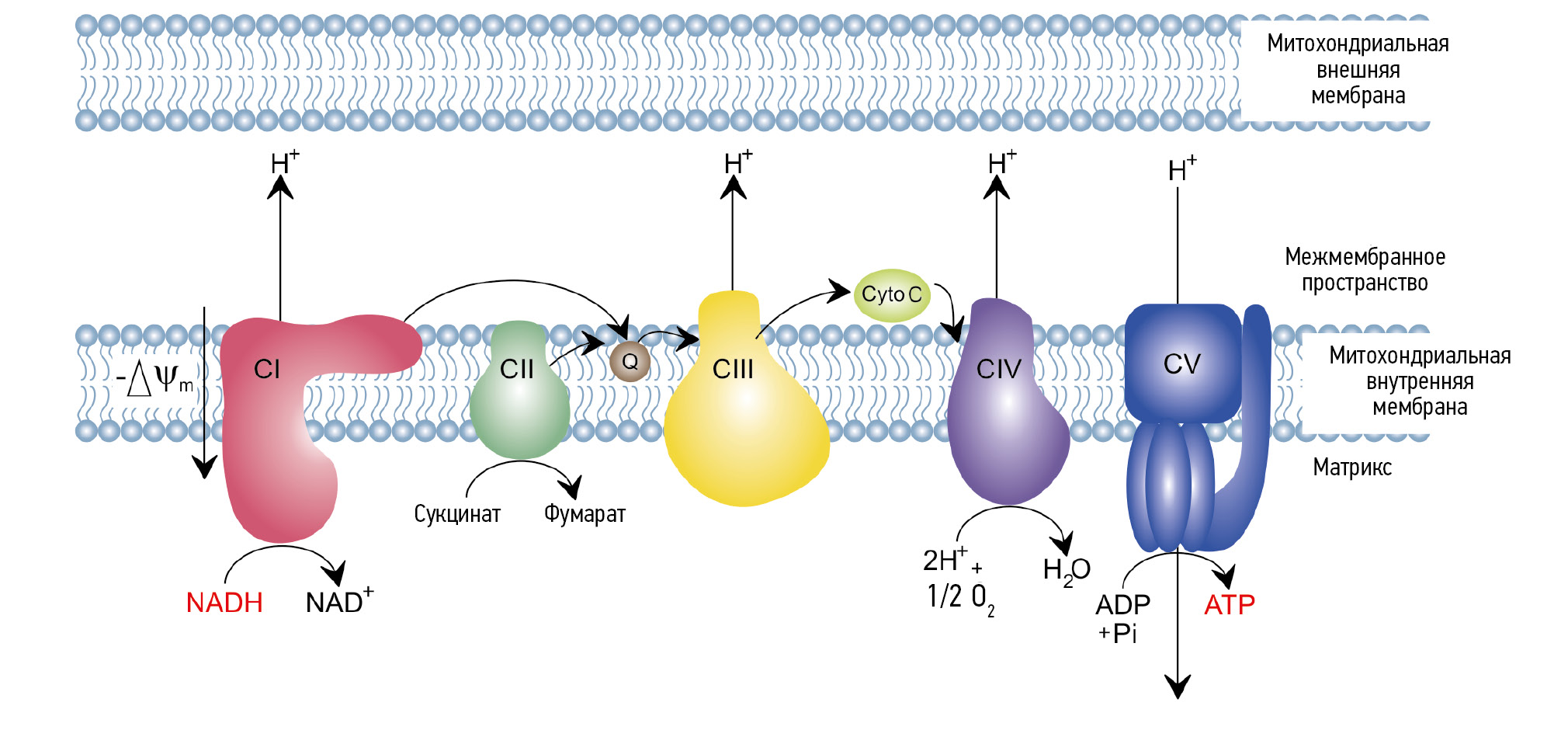 Электронтранспортная цепь (ЭТЦ) на внутренней мембране митохондрии состоит из четырёх комплексов (I — NADH-дегидрогеназа, II — сукцинат-дегидрогеназа, III — QH2-дегидрогеназа, IV — цитохром оксидаза) и двух низкомолекулярных переносчиков (коэнзим Q и цитохром С). Все компоненты ЭТЦ встроены последовательно в порядке возрастания редокс-потенциалов. Чем отрицательнее редокс-потенциалы системы, тем выше её способность отдавать электроны (восстановители). Чем положительнее редокс-потенциал, тем выше способность вещества присоединять электроны (окислители). Самым высоким редокс-потенциалом обладает кислород, в связи с этим электроны переносятся по цепи переноса электронов до кислорода с образованием воды. Принцип работы ЭТЦ — разделение потока протонов и электронов, образующихся в матриксе. Электроны передаются на конечный акцептор (кислород), протоны выбрасываются в митохондриальное межмембранное пространство. В результате этого процесса образуется электрохимический градиент между матриксом (высокий pH, низкий H+) и межмембранным пространством (низкий pH, высокий H+). По закону осмоса ионы водорода начинают проникать в матрикс, активируя АТФ-синтазу, которая катализирует превращение АДФ в АТФ (рис. 1, [3]). Субстраты (NADH, FADH2), на которые действуют ферменты ЭТЦ, образуются в матриксе в результате цикла Кребса и их поступления из цитозоля.