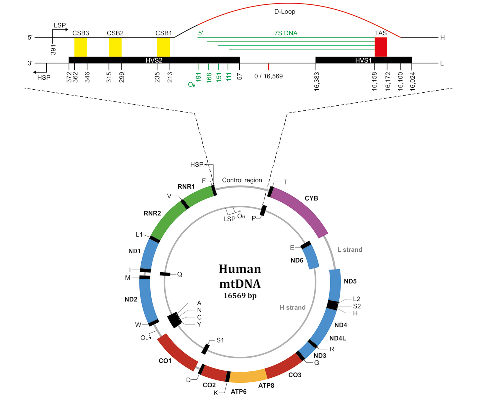 Рис. 2. Карта митохондриального генома человека [по 5–7]. HSP — heavy strand promoter (промотор тяжелой цепи); LSP — light strand promoter (промотор лёгкой цепи); D-Loop — Д-петля); control region — контрольная область, контролирующая синтез РНК и ДНК (локализация между 16024 и 576 bp); CSB1, CSB2, CSB3 — консервативные блоки 1, 2 и 3; 7S DNA — короткая третья цепь мтДНК в области D-петли; OH — начало репликации тяжёлой цепи мтДНК; OL — начало репликации лёгкой цепи мтДНК; TAS — termination associated sequence (последовательность, связанная с терминацией); H, L — тяжёлая и лёгкая цепи мтДНК; T, P, E, L2, S2, H, R, G, K, D, S1, A, N, C, Y, W, M, Q, I, L1, V, F — гены tRNA; CYB — ген цитохрома В; ND6, ND5, ND4, ND3, ND2, ND1 — гены субъединиц NADH-дегидрогеназы; СО3, СО2, СО1 — гены субъединиц цитохромоксидазы; RNR2 и RNR1 — гены митохондриальных 16S и 12S рибосомных РНК. / Fig. 2. Мap of the human mitochondrial genome [by 5–7]. HSP — heavy strand promoter; LSP — light strand promoter; control region — control region that controls the synthesis of RNA and DNA (localisation between 16024 and 576 bp); CSB1, CSB2, CSB3 — conservative blocks 1, 2 and 3; 7S DNA — short third strand of mtDNA in the D-loop region; OH — origin of mtDNA heavy strand replication; OL — origin of mtDNA light strand replication; TAS — termination-associated sequence; H, L — mtDNA heavy and light strands; T, P, E, L2, S2, H, R, G, K, D, S1, A, N, C, Y, W, M, Q, I, L1, V, F — tRNA genes; CYB — cytochrome B gene; ND6, ND5, ND4, ND3, ND2, ND1 — NADH-dehydrogenase subunit genes; CO3, CO2, CO1 — cytochrome oxidase subunit genes; RNR2 and RNR1 are mitochondrial 16S and 12S ribosomal RNA genes.