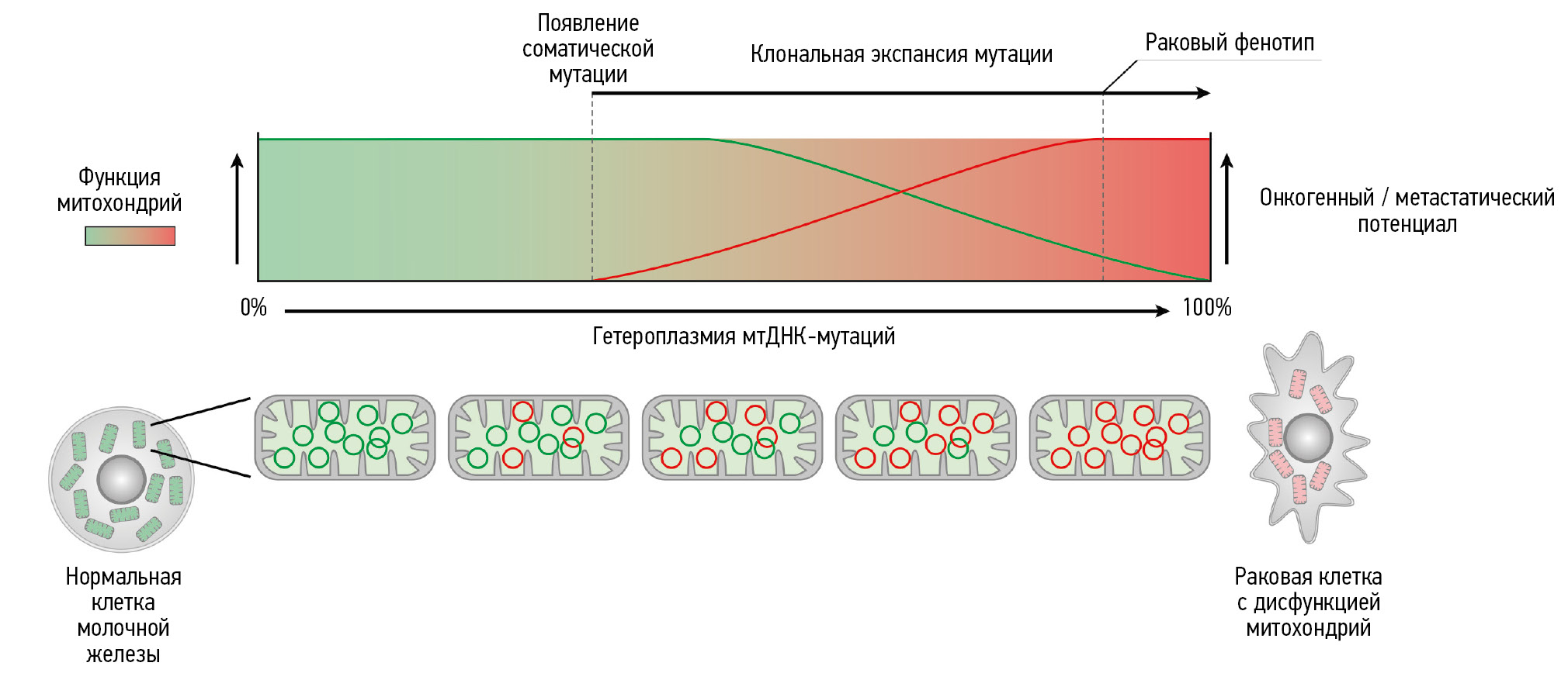 Соматические мутации мтДНК появляются в отдельных соматических клетках (кроме половых) и способствуют образованию в части ткани клеточных клонов, генотипически отличных от соседних нормальных и зародышевых линий клеток. Установлено, что в раковых тканях эти мутации становятся гомоплазмичными. По данным C.J. Pérez-Amado с соавт. [58], соматические мутации обнаруживаются в 73% исследованных раковых тканей молочной железы. Однонуклеотидные мутации составляют 98% (из них 10% трансверсии и 84% транзиции), делеции — 1%, инсерции — 1%. Самый высокий уровень соматических мутаций отмечается в области D-петли (95,4 мутации на 1000 п. н.), на втором месте — ген тРНК цистеина (92,3 мут./кб), а на третьем — тРНК треонина (92,3 мут./кб). Y.S. Ju с соавт. [59] на обширном материале исследования раковых тканей, взятых из различных злокачественных новообразований, установили, что высокий уровень соматических мутаций фундаментально связан с репликацией мтДНК. В отличие от нейтральных изменяющие белок мутации подвергаются отрицательному отбору и являются почти всегда гетероплазмичными, т.е. для выживания раковой опухоли нужно определённое количество нормально функционирующих митохондрий.