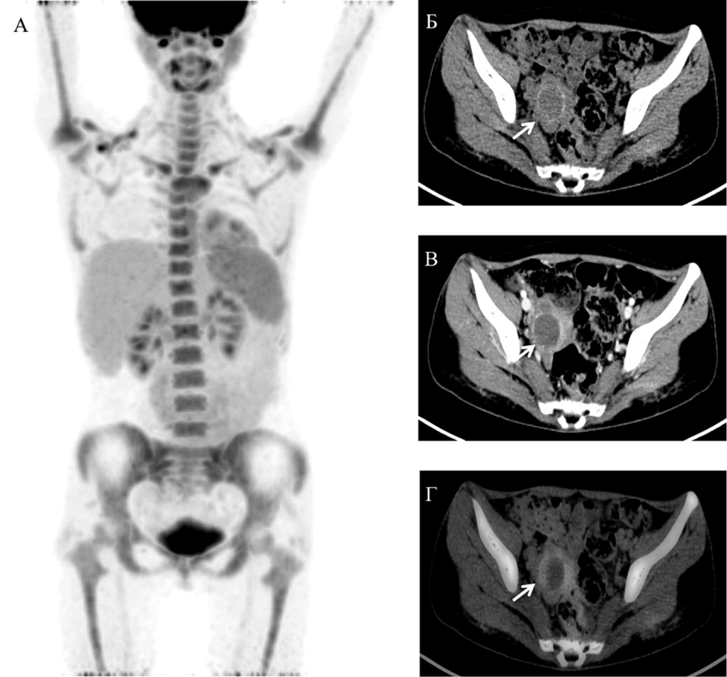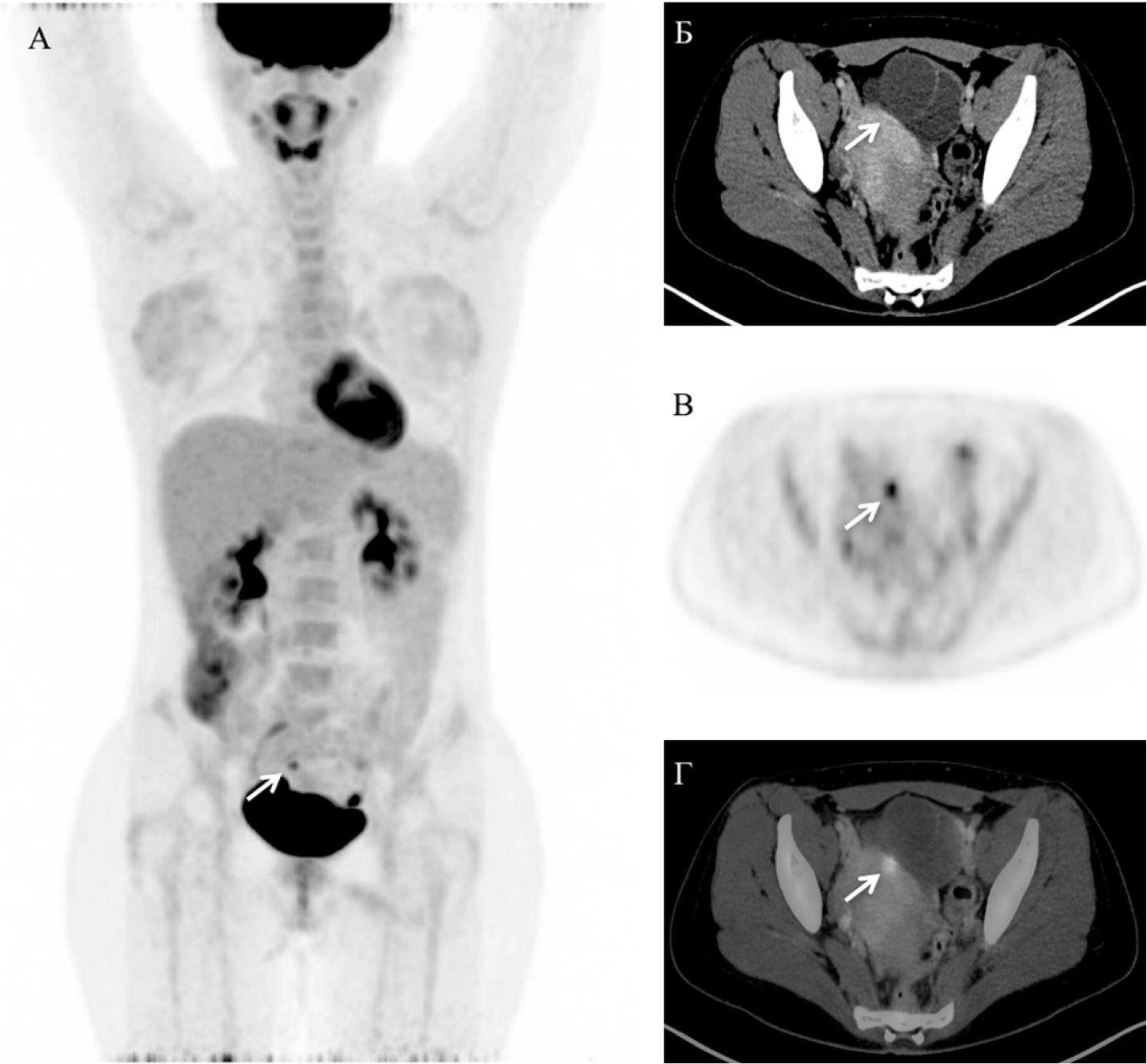 Рис. 4. Позитронная эмиссионная томография (MIP-реконструкция) во фронтальной проекции (А), компьютерная томография без контрастного усиления (Б), КТ с внутривенным контрастным усилением (В), совмещённое ПЭТ/КТ-изображение (Г) в аксиальной проекции. Стрелками указано неинтенсивное повышение накопления 18F-ФДГ (Г) по периферии узлового образования в области дна матки справа (Б, В)