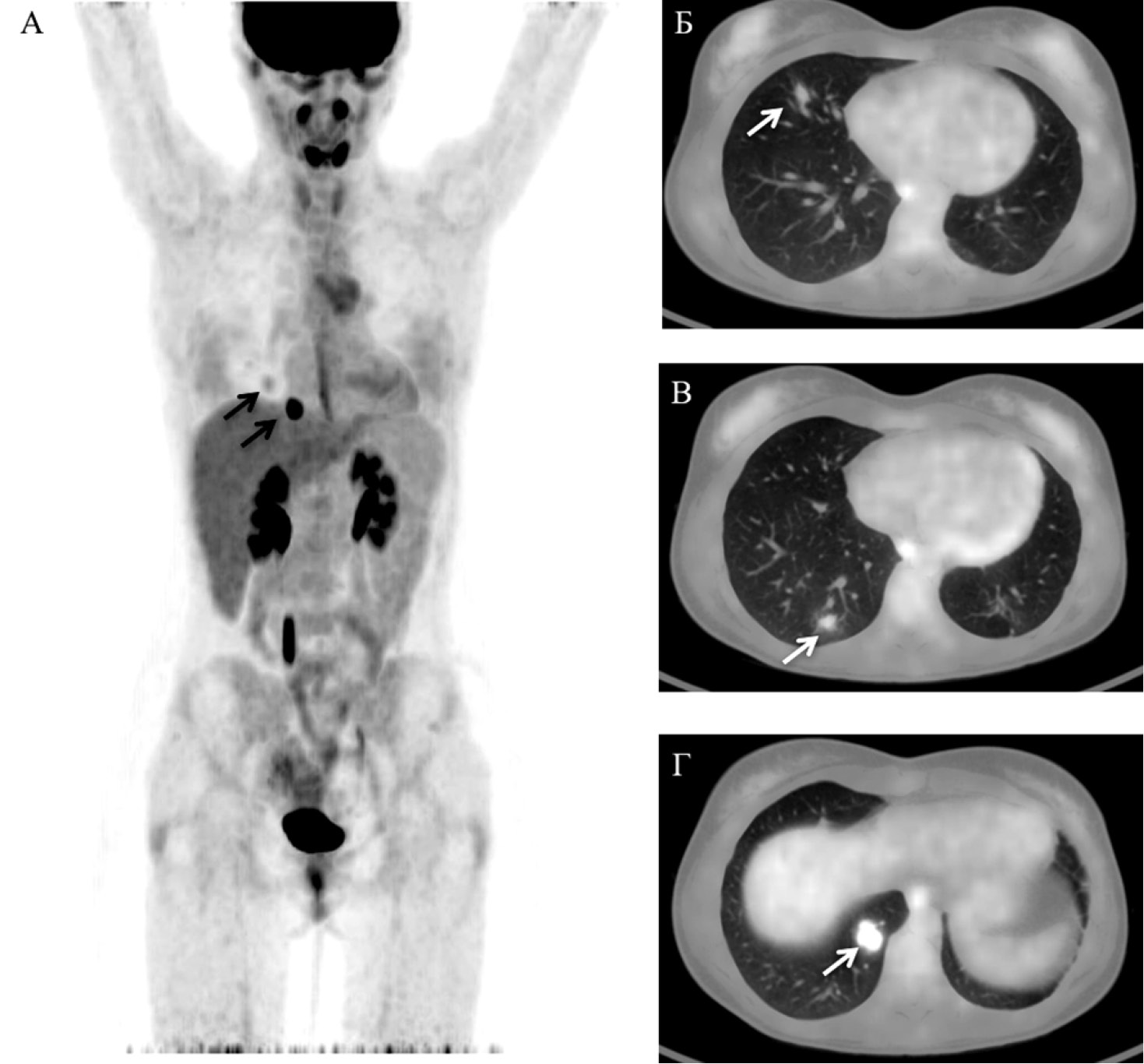 Рис. 2. Позитронная эмиссионная томография (MIP-реконструкция) во фронтальной проекции (А), совмещённые ПЭТ/КТ-изображения (Б, В, Г) в аксиальной проекции. Стрелками указаны очаги патологического накопления 18F-ФДГ в образованиях правого лёгкого