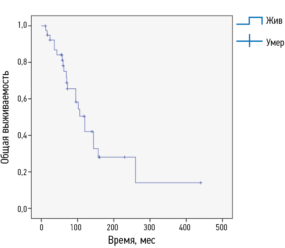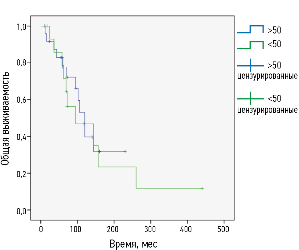 Возраст — один из основных и независимых прогностических факторов. Так, медиана ОВ была выше в возрастной группе до 50 лет, в сравнении с более старшей возрастной группой: 120 мес и 95 мес соответственно, хотя и без статистической значимости (p >0,05). Более подробно данные отражены в рис. 2.