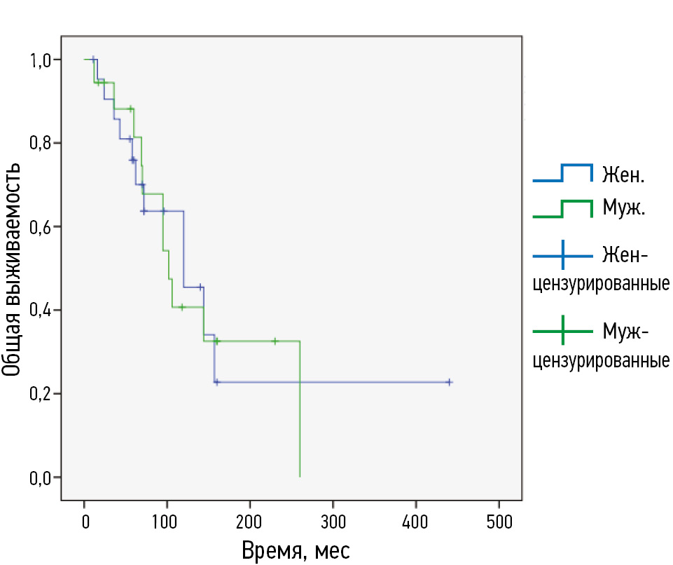 Нами было отмечено статистически не значимое (р >0,05) различие в показателях ОВ в зависимости от пола в обеих исследуемых группах: у женщин медиана ОВ составила 120 мес, а у мужчин — 102 мес, что, вероятнее всего, связано с изначальным преобладанием лиц женского пола в исследовании (рис. 3).