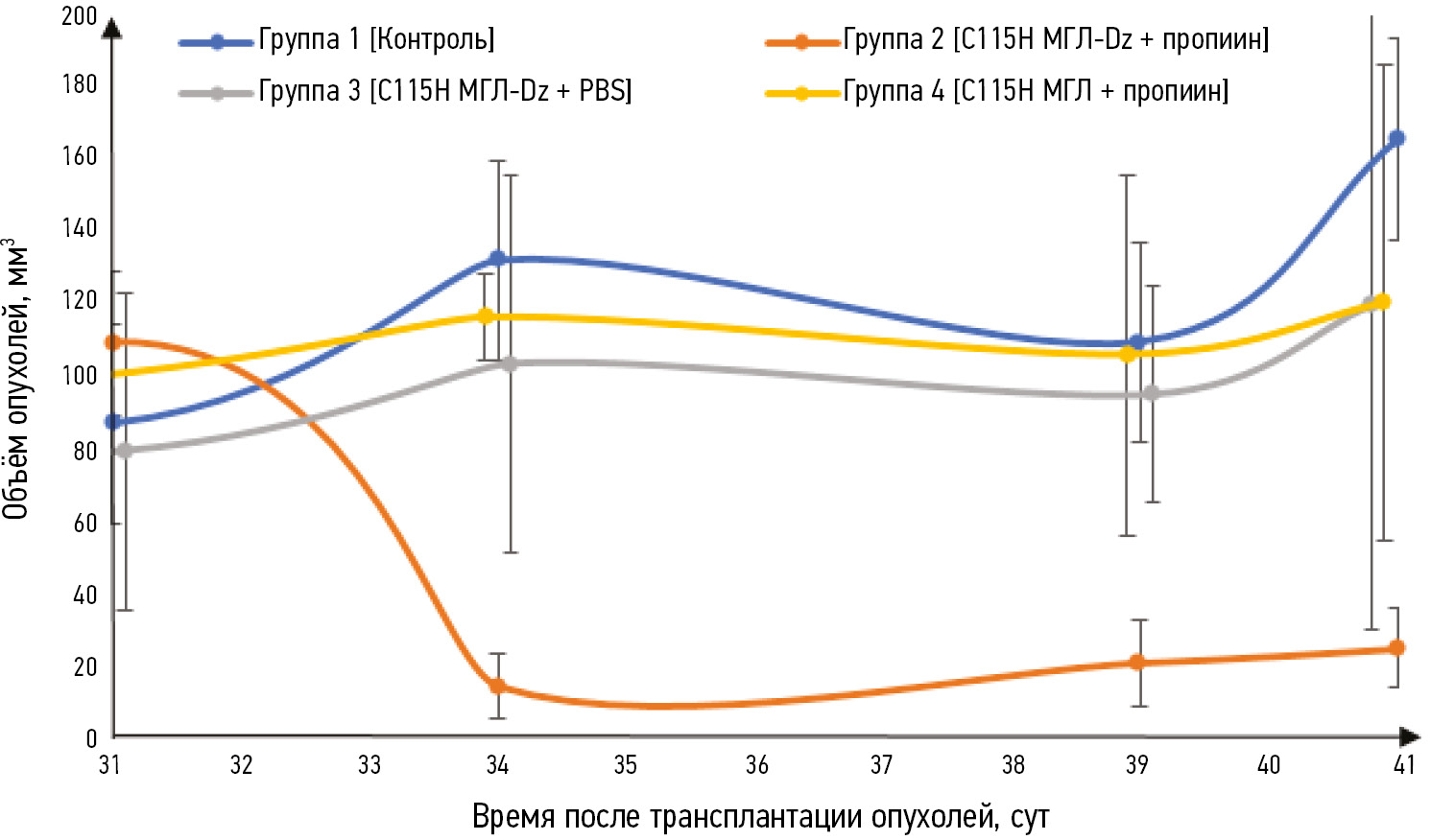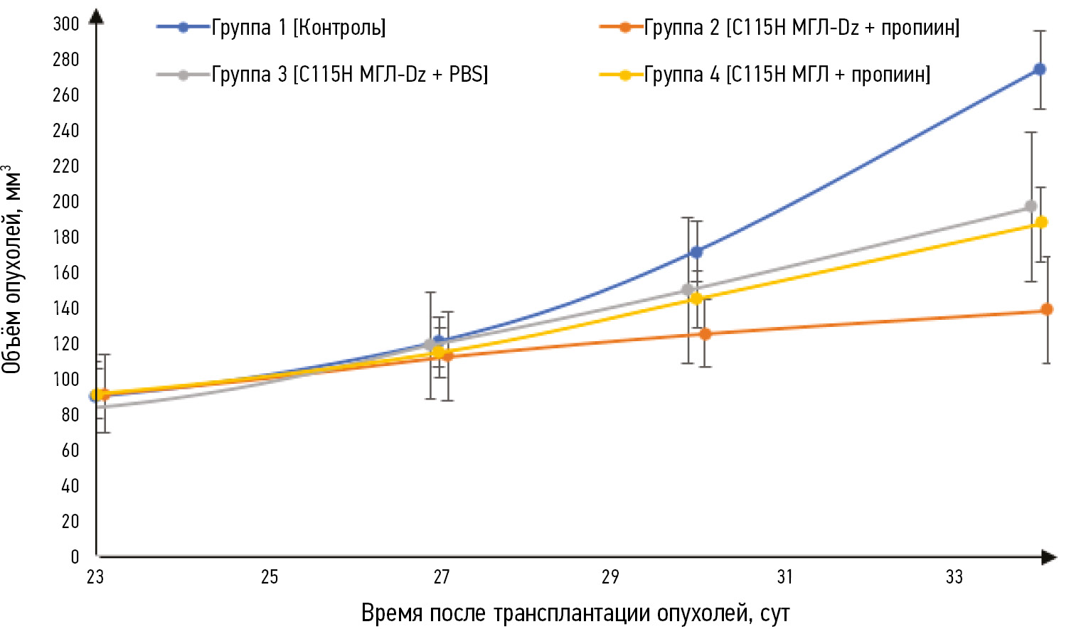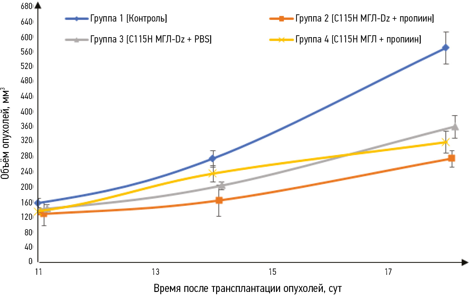 Объём опухоли измеряли 2 раза в неделю с помощью электронного штангенциркуля. Противоопухолевую активность фармакологической пары «С115Н МГЛ-Dz + пропиин» оценивали по торможению роста опухоли (TРО, %), у экспериментальных животных по сравнению с контролем. ТРО оценивали по формуле: