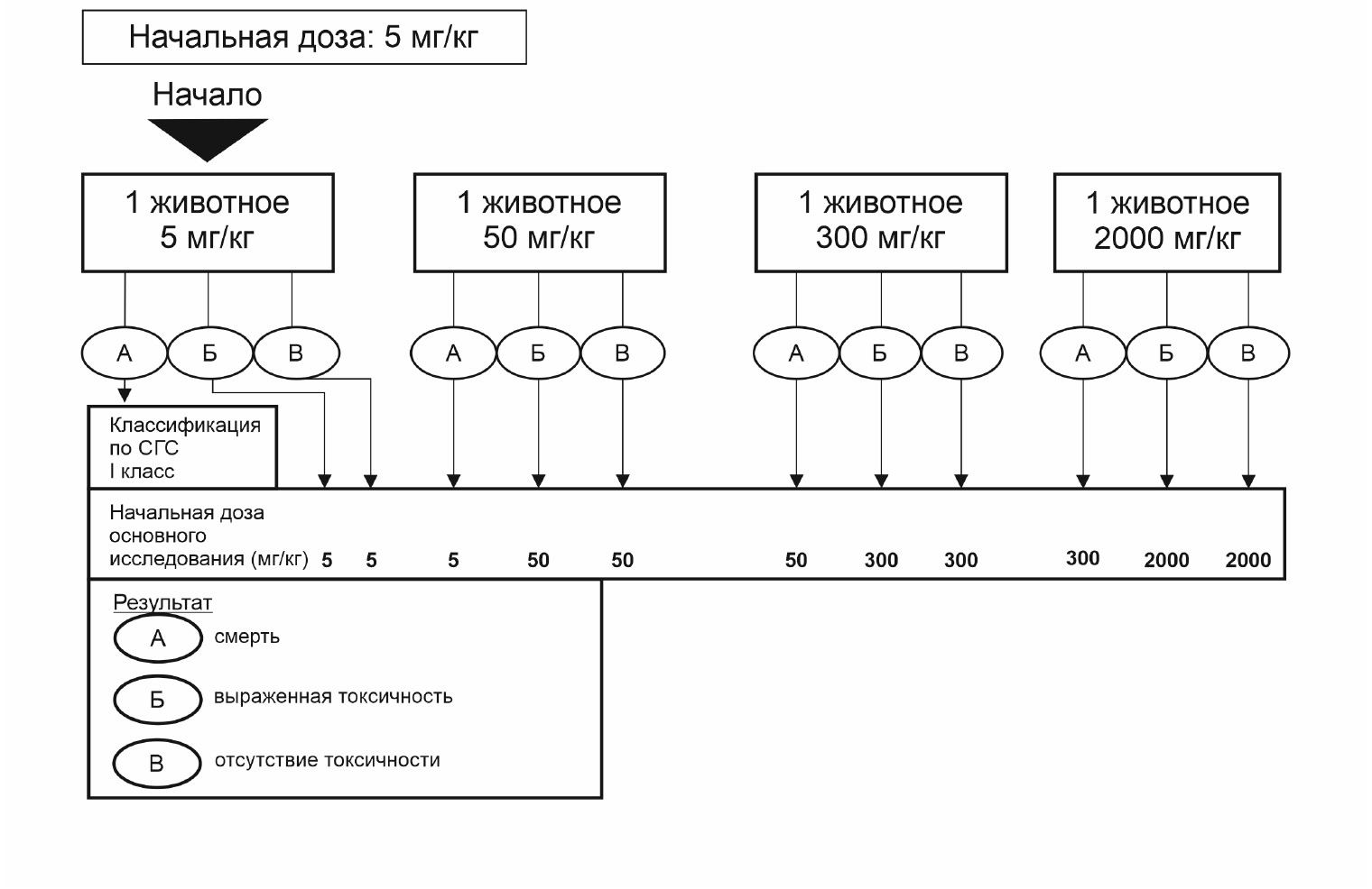 Fig. 2. Scheme for determining the toxicity class (according to the Globally Harmonized System of Classification and Labelling of Chemicals) by the “fixed dose” method using the Organization for Economic Co-operation and Development 420 protocol during the main test.