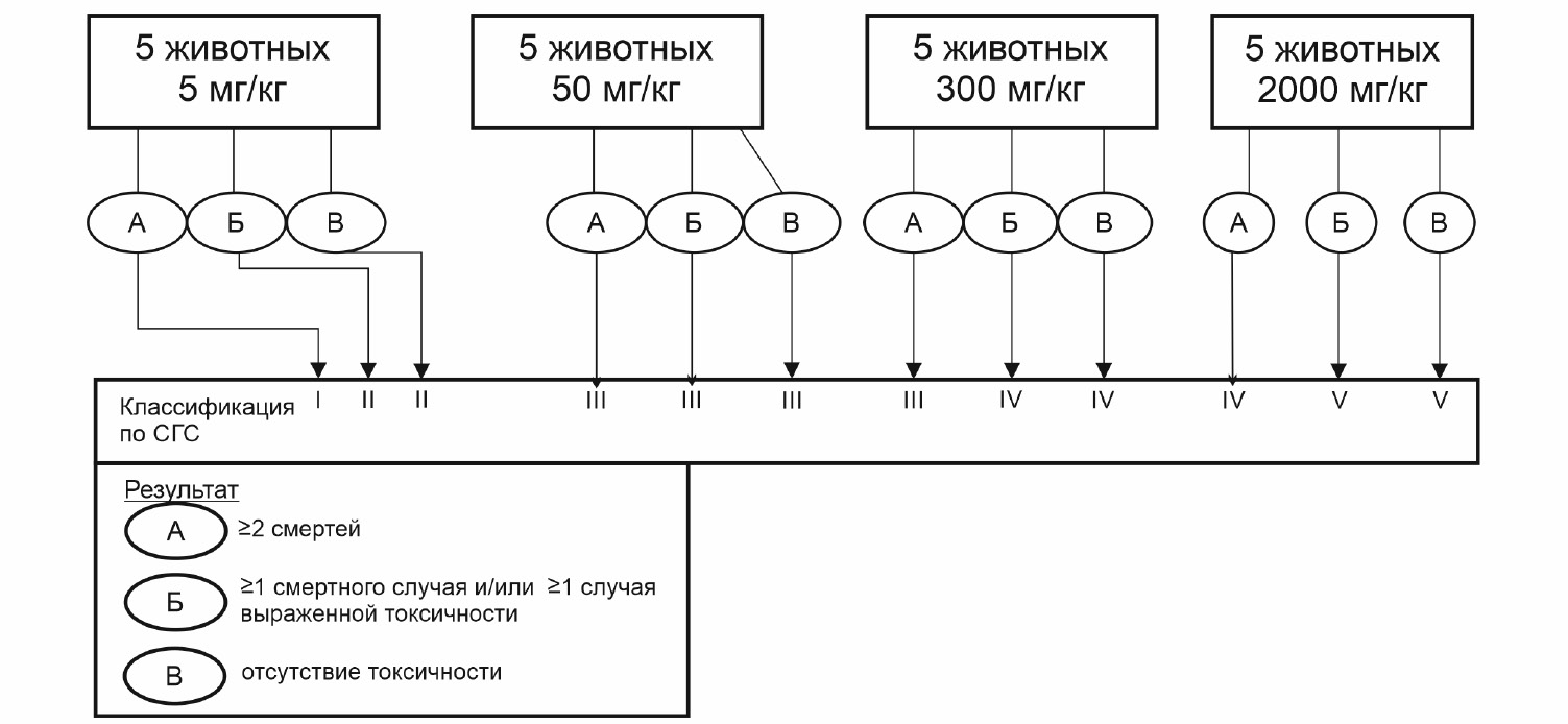 Fig. 1. Scheme for determining the toxicity class (according to the Globally Harmonized System of Classification and Labelling of Chemicals) by the “fixed dose” method using the Organization for Economic Co-operation and Development 420 protocol in a preliminary test.