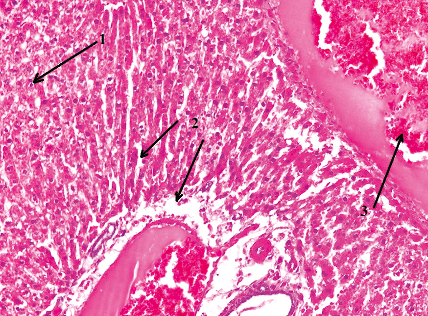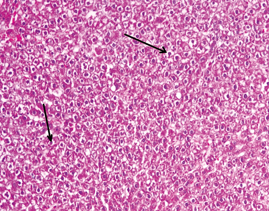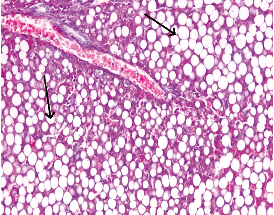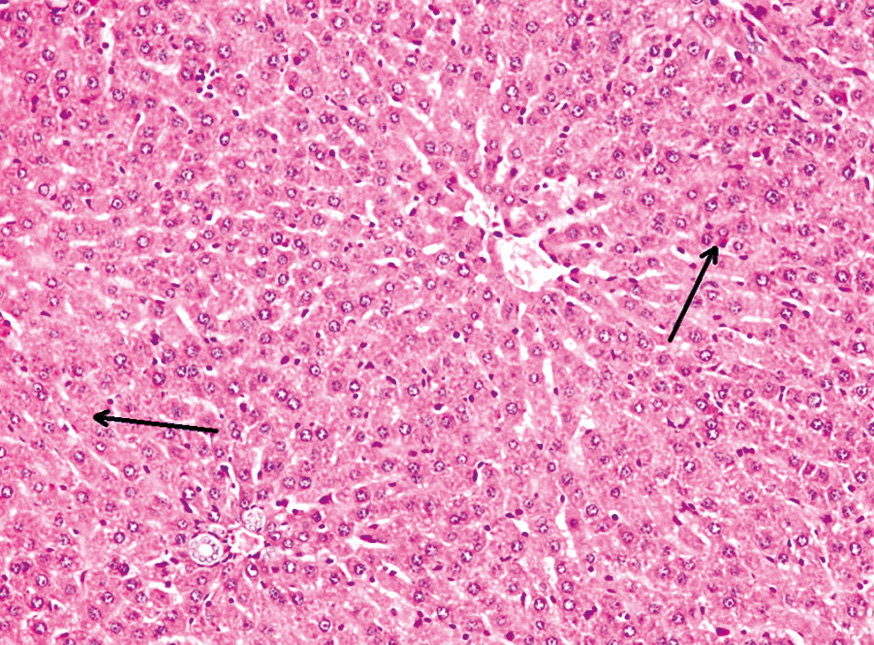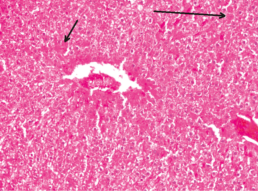 Образцы ткани (печень) для световой микроскопии фиксировали в 10% забуференном нейтральном формалине с последующим заключением в парафин и микротомированием по классической методике подготовки гистологических препаратов. На ротационном микротоме из парафиновых блоков с образцами ткани изготавливали серийные срезы толщиной 3–5 мкм и наносили их на предметные стёкла. Для визуализации морфологических изменений использовали обзорный метод окраски гематоксилином и эозином по классическому протоколу. Микроскопическое исследование и фотофиксацию полученных гистологических препаратов осуществляли с помощью светового микроскопа LEICA DM4000 B (Leica Microsystems, Германия) с цифровой камерой Leica DFC490.