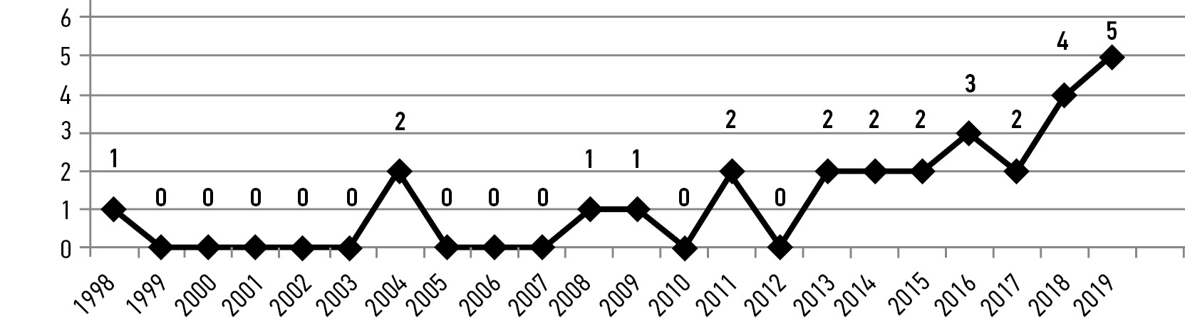 Рис. 1. Распределение случаев заболевания РМЖ у мужчин в Красноярском крае по годам / Fig. 1. Yearly distribution of male breast cancer cases in Krasnoyarsky kray