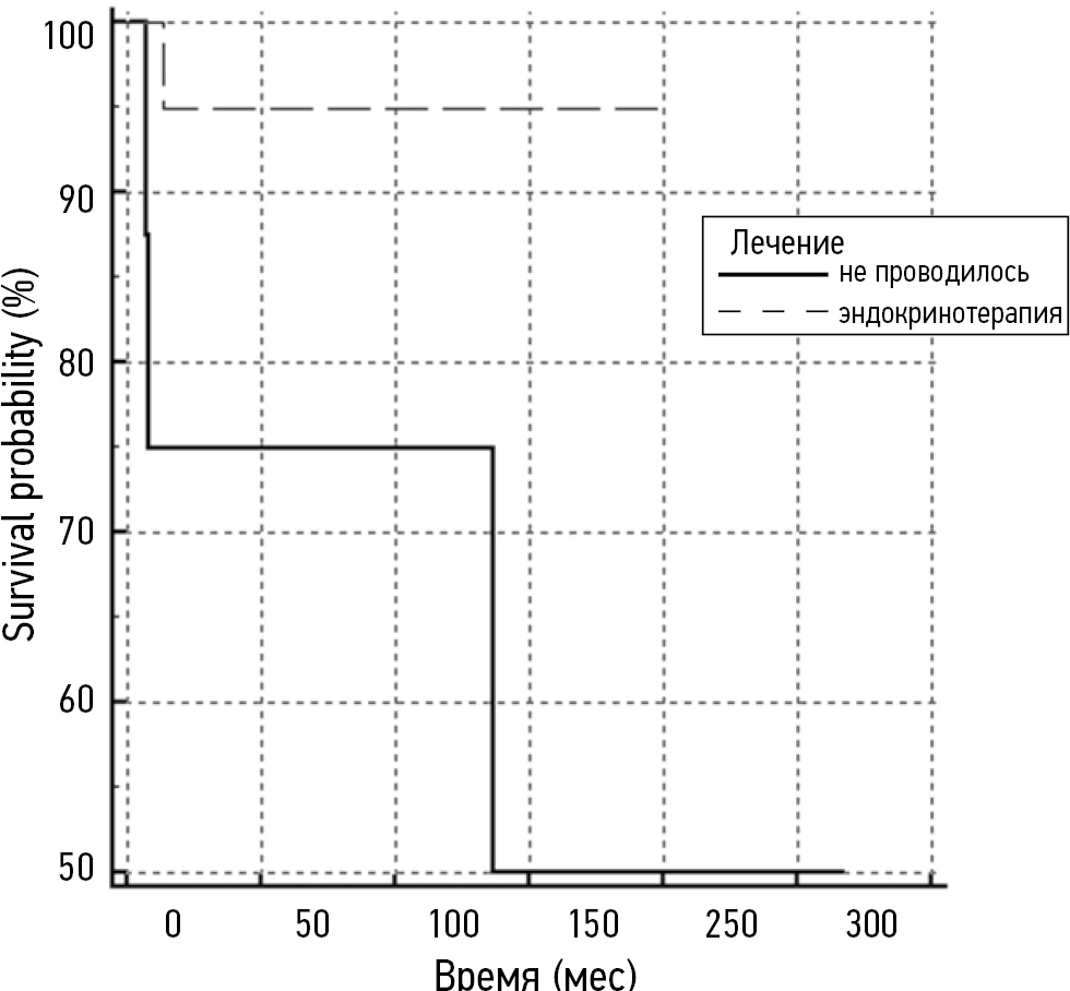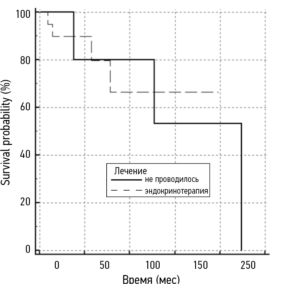 Анализ общей выживаемости пациентов мужского пола с РМЖ продемонстрировал положительное влияние проводимой гормонотерапии на показатели дожития этих больных (рис. 2). Так, в группе пациентов без проведения терапии гормональными препаратами медиана выживаемости была достигнута через 137 мес, в группе больных с адъювантной эндокринотерапией медиана выживаемости не была достигнута (р=0,07).