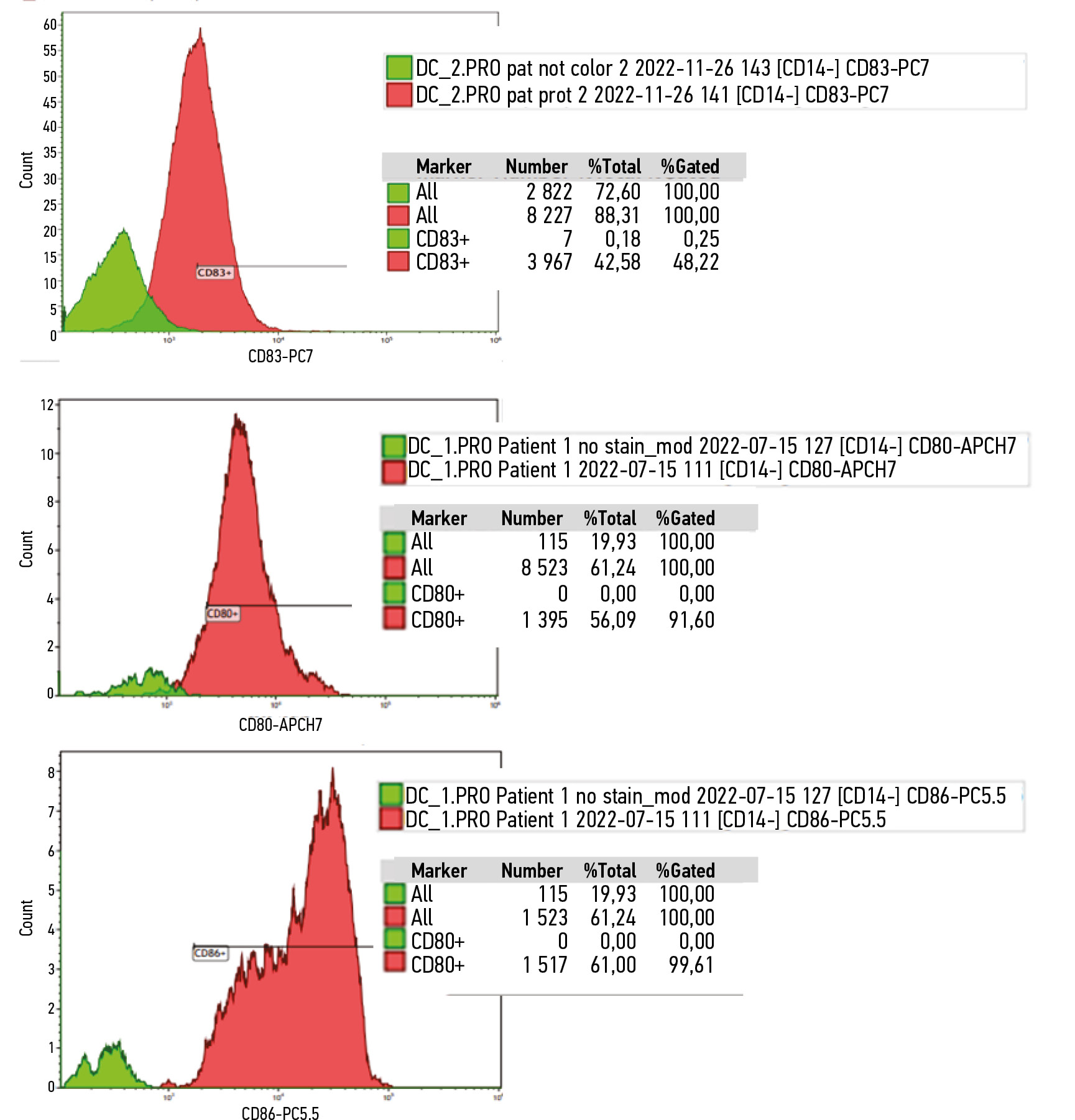 Обработка результатов проточной цитофлуориметрии проводилась в программе Kaluza (Beckman Coulter, США). Дифференцировку и созревание ДК оценивали по уровню экспрессии следующих иммунофенотипических маркёров: