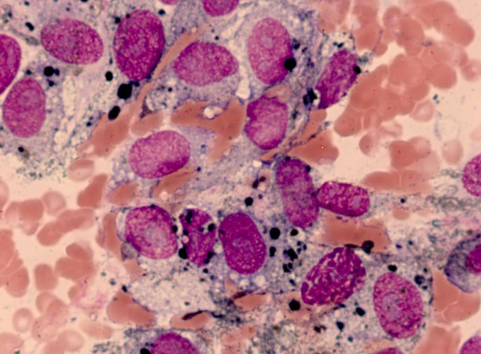 Рис. 2. Тонкоигольная пункционная биопсия лимфатического узла. Смешанноклеточная меланома. Окрашивание по Паппенгейму, ×1000.