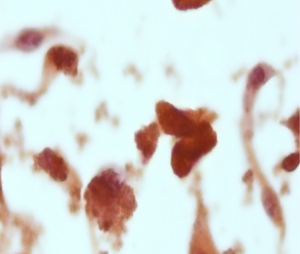 Fig. 6. Fine-needle aspiration biopsy of the lymph node by liquid based cytology. Mixed cell melanoma. Immunopositive (+++) reaction to HMB-45 marker. Use of a polymer immunodetection system, ×1000.