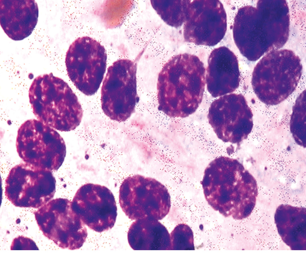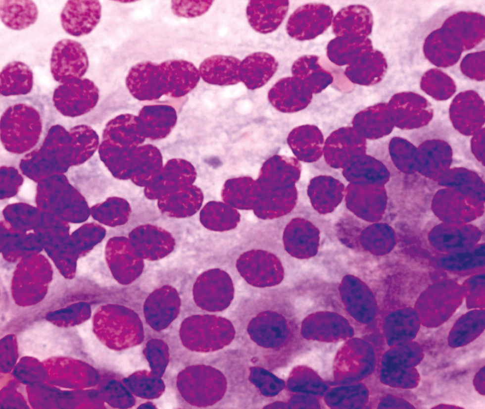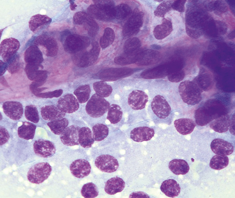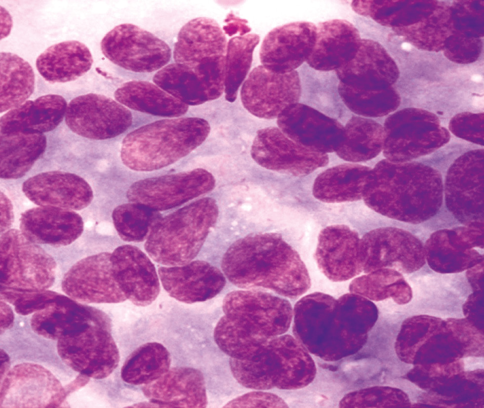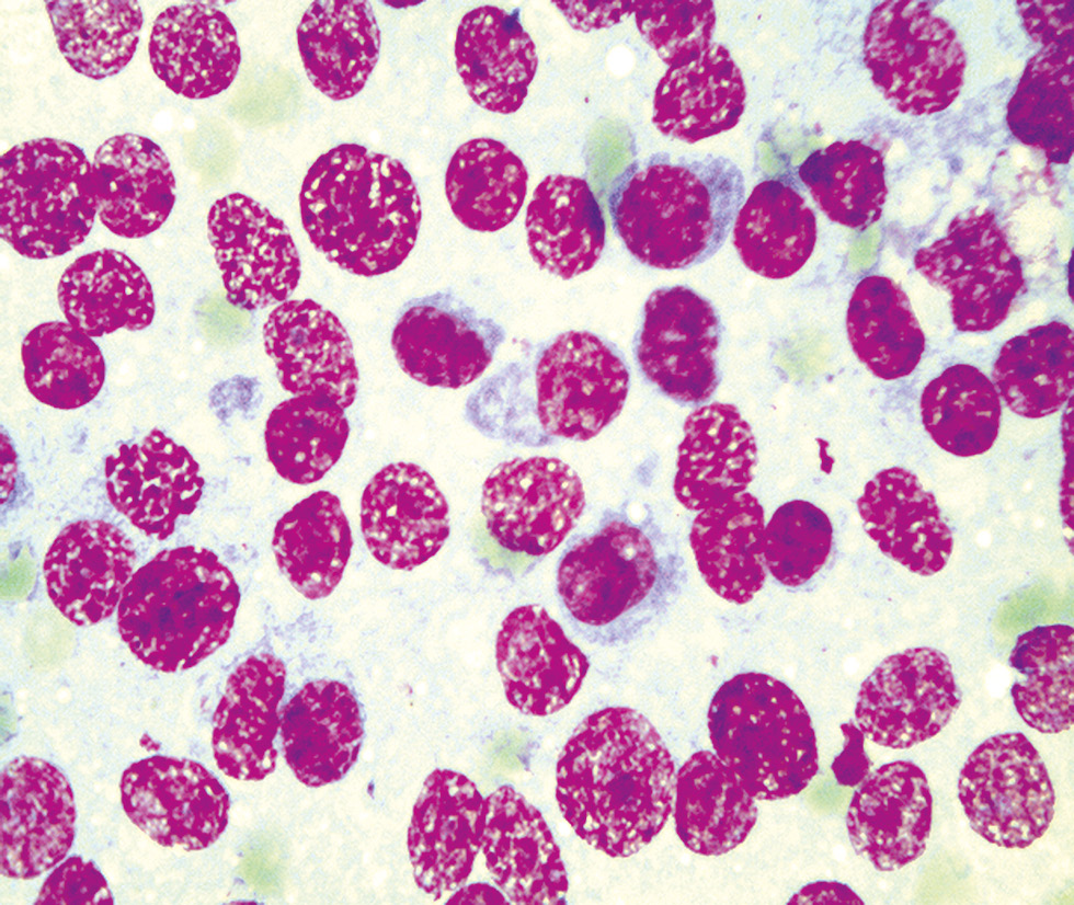Рис. 1. Цитологический препарат типичного карциноида лёгкого. Мономорфные ядра с чёткими контурами и хроматином цвета «соли и перца» с мелкими ядрышками. Окрашивание по Паппенгейму. Увеличение ×400.