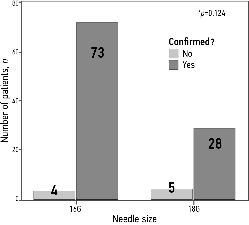 There were no significant differences in the incidence of cases with confirmed diagnosis depending on the biopsy needle size (p=0.124) (Fig. 1).