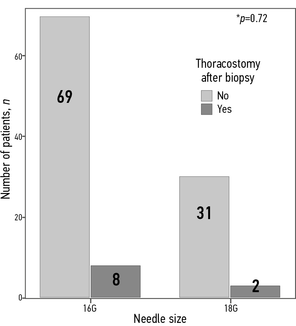 Moreover, the biopsy needle size (16G or 18G) had no significant effect on the total incidence of complications (18.2% and 9%, respectively; p=0.266) (Fig. 2) or the incidence of thoracostomy for postprocedural pneumothorax (10.4% and 6%, respectively; p=0.72) (Fig. 3).