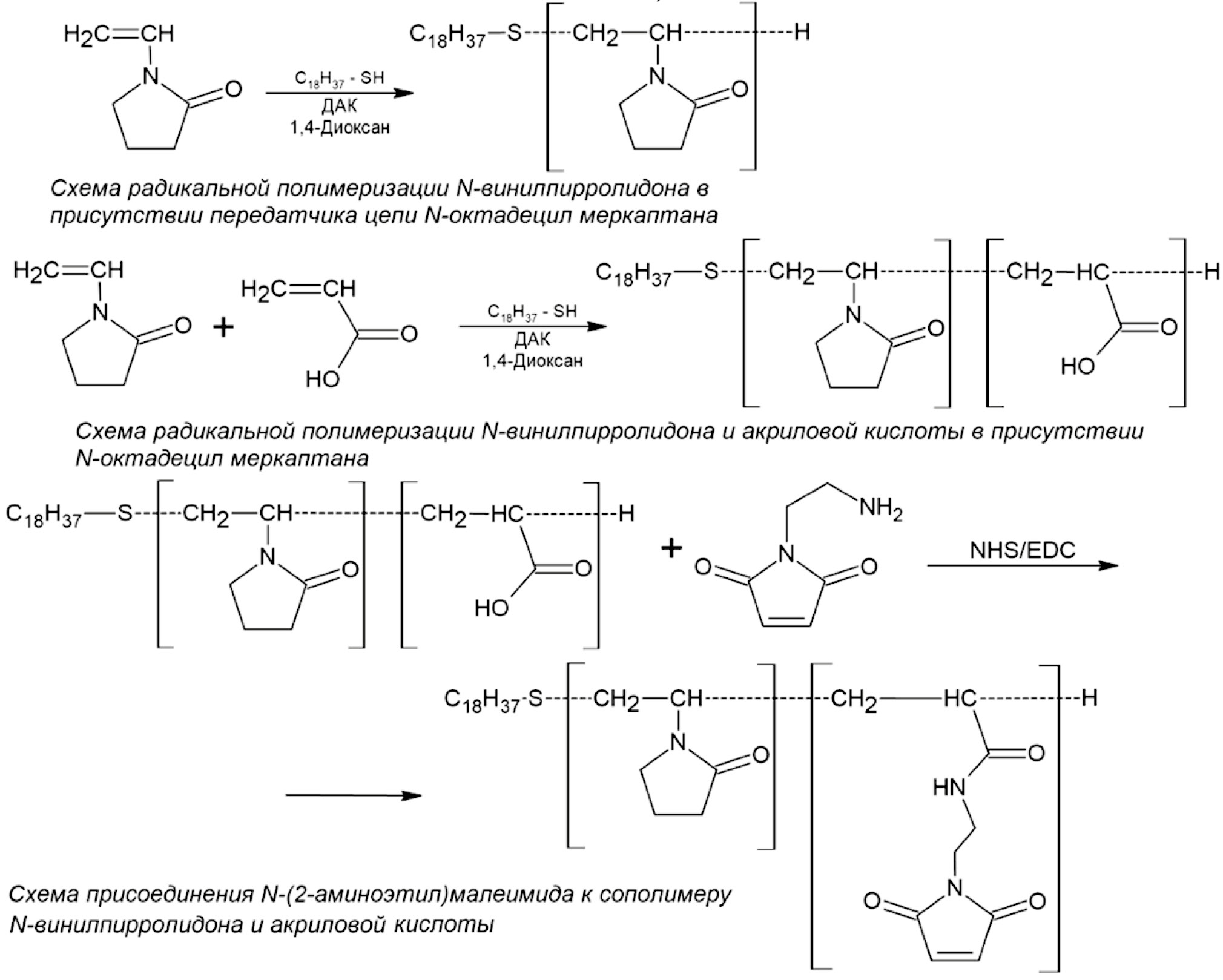 A series of variants of amphiphilic N-vinylpyrrolidone polymers with varying hydrophilic composition were derived. In the first variant (Amph-PVP), the water-soluble block was represented by a N-vinylpyrrolidone polymer, and in the second variant (Amph-PVP-AA), it was represented by a copolymer of N-vinylpyrrolidone and acrylic acid. The incorporation of acrylic acid enables the introduction of 1% to 5% functional carboxyl groups, which may be used for subsequent surface modification of nanocarriers derived from these polymers [15]. In this study, the carboxyl group of acrylic acid was used to introduce maleimide functional groups into the polymer structure, thereby enabling the subsequent conjugation of a targeted anticancer agent under mild conditions. The hydrophilic segment, comprising copolymers of N-vinylpyrrolidone and acrylic acid, underwent modification with 1-(2-aminoethyl)maleimide in the presence of EDS/NHS as an intermediate. Subsequent to this modification, amidation was initiated, resulting in the formation of the Amph-PVP-AA-Mal polymer (Fig. 1).