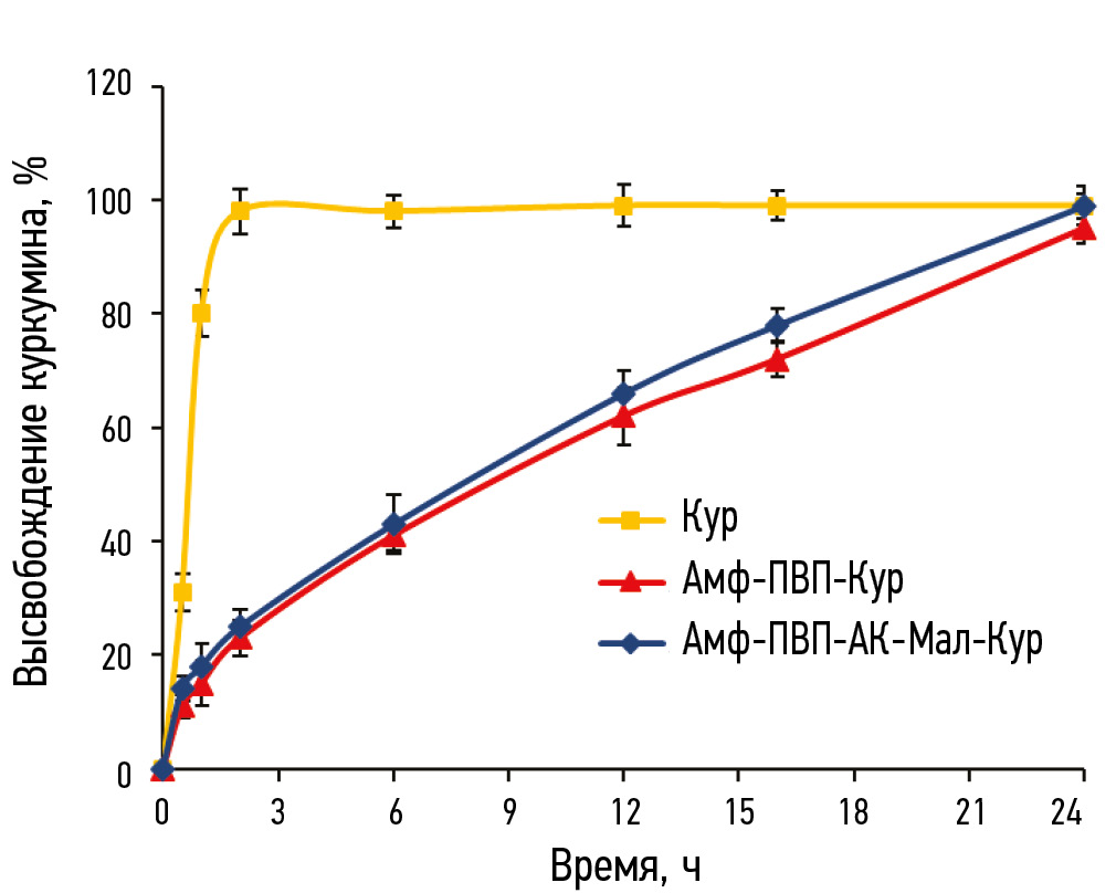 Note. Amph-PVP-Cur — nanoparticles from amphiphilic derivatives of poly-N-vinylpyrrolidone loaded with curcumin; Amph-PVP-AA-Mal-Cur — nanoparticles from amphiphilic derivatives of poly-N-vinylpyrrolidone copolymers with acrylic acid modified with maleimide and loaded with curcumin.