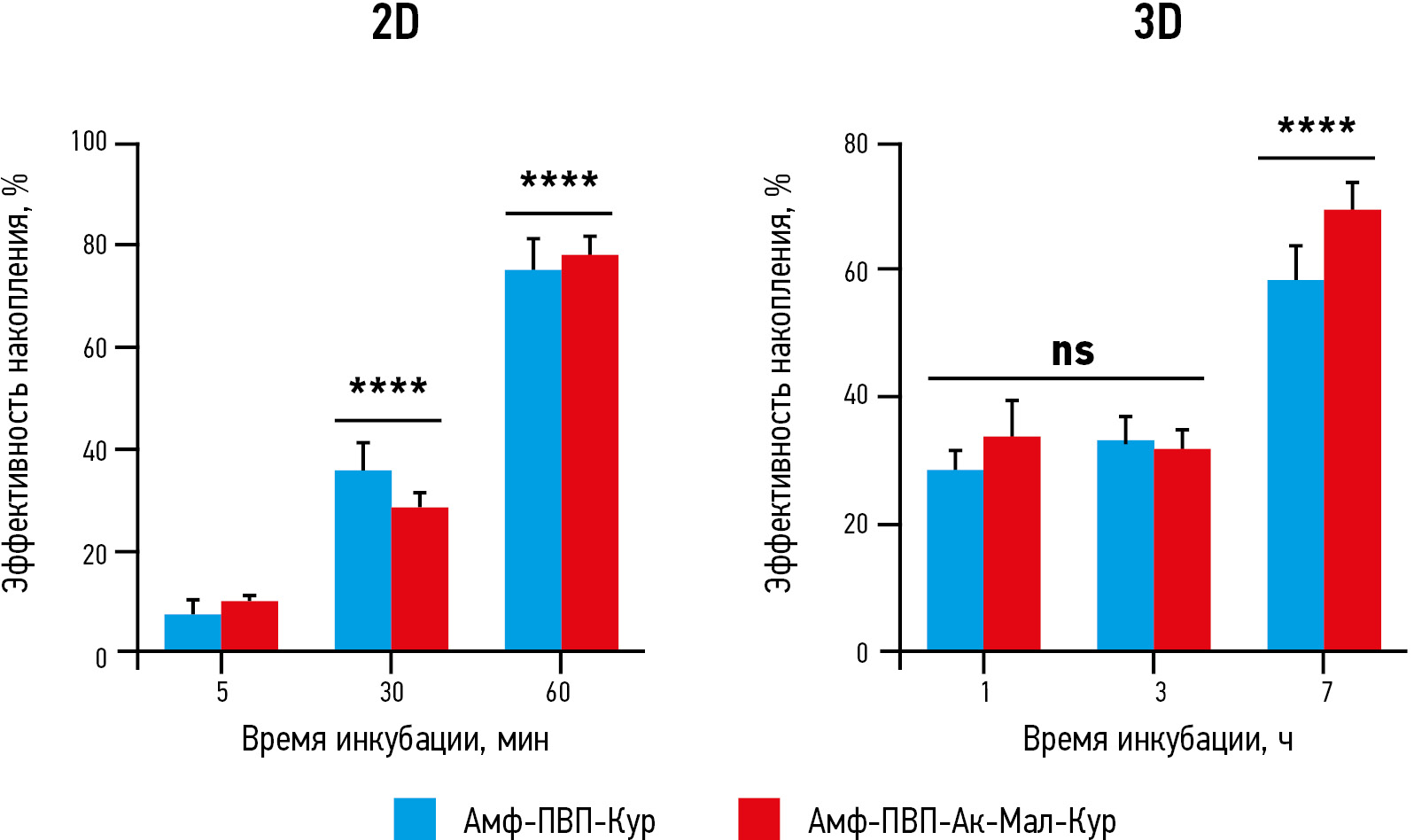 For spheroids (3D in vitro model), no significant difference in sample accumulation was observed, but the accumulation efficiency decreased significantly. For example, the accumulation levels of Amph-PVP-Cur and Amph-PVP-AA-Mal-Cur were 29% and 34% after 1 h of incubation, 33% and 32% after 3 h, and 59% and 70% after 7 h, respectively.