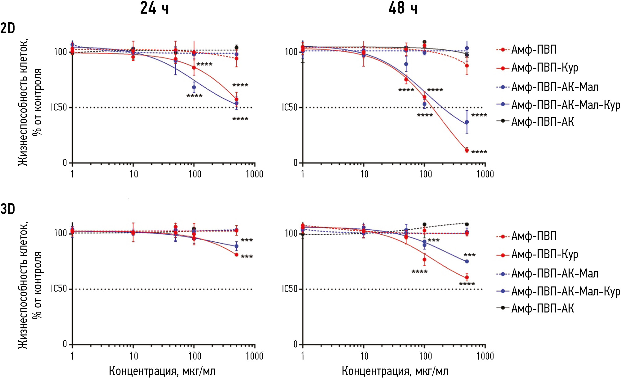 Note. * IC50 is a semi-inhibitory concentration. Amph-PVP — nanoparticles from amphiphilic derivatives of poly-N-vinylpyrrolidone; Amph-PVP-AA — nanoparticles from copolymers of amphiphilic derivatives of poly-N-vinylpyrrolidone with acrylic acid; Amph-PVP-AA-Mal — specified nanoparticles modified with maleimide; Amph-PVP-Cur — nanoparticles from amphiphilic derivatives of poly-N-vinylpyrrolidone loaded with curcumin; Amph-PVP-AA-Mal-Cur — nanoparticles from amphiphilic derivatives of poly-N-vinylpyrrolidone copolymers with acrylic acid modified with maleimide and loaded with curcumin.