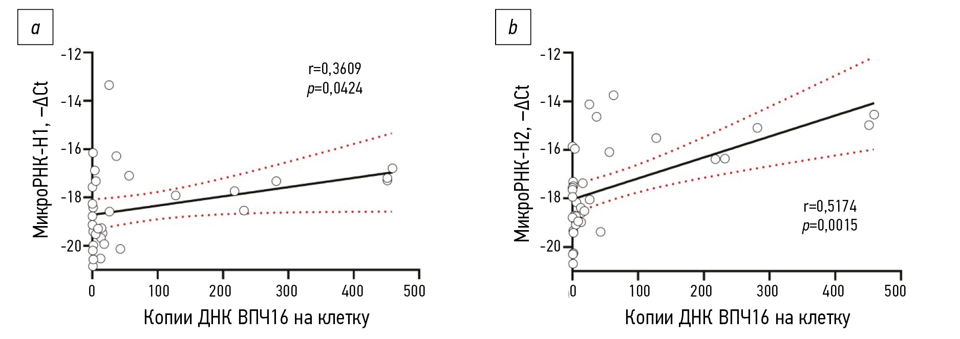 Рис. 2. Корреляционный анализ экспрессии вирусных микроРНК-H1 (a) и микроРНК-H2 (b) от вирусной нагрузки HPV16, r — коэффициент корреляции, p — значение p-value.