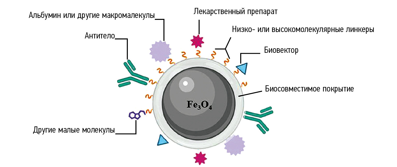 Рис. 1. Гибридные наносистемы биомедицинского назначения на основе наночастиц смешанного оксида железа Fe3O4.
