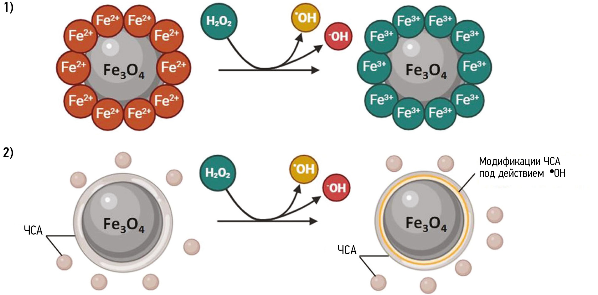 В работе исследованы созданные нами наносистемы диаметром 20–50 нм на основе МНЧ смешанного оксида железа, синтезированного и стабилизированного по методике, представленной в работе Прусакова В.Е. и соавт. [21], с белковым покрытием из ЧСА, которые получены путём адсорбции белка и закрепления свободнорадикальным методом на поверхности МНЧ молекул ЧСА [22] по Фентонподобной реакции (рис. 2), как описано в наших предыдущих работах [23, 24]. Методика позволяет сохранять функциональные свойства альбумина на поверхности МНЧ [25, 26] и включает приготовление реакционной системы, содержащей ЧСА и МНЧ в 0,05 М фосфатном буфере pH 6,5 с добавлением пероксида водорода. Для подбора условий нанесения покрытия из ЧСА на поверхность МНЧ концентрацию ЧСА варьировали от 0,4 до 3,2 мг/мл при постоянной концентрации МНЧ 0,2 мг/мл.