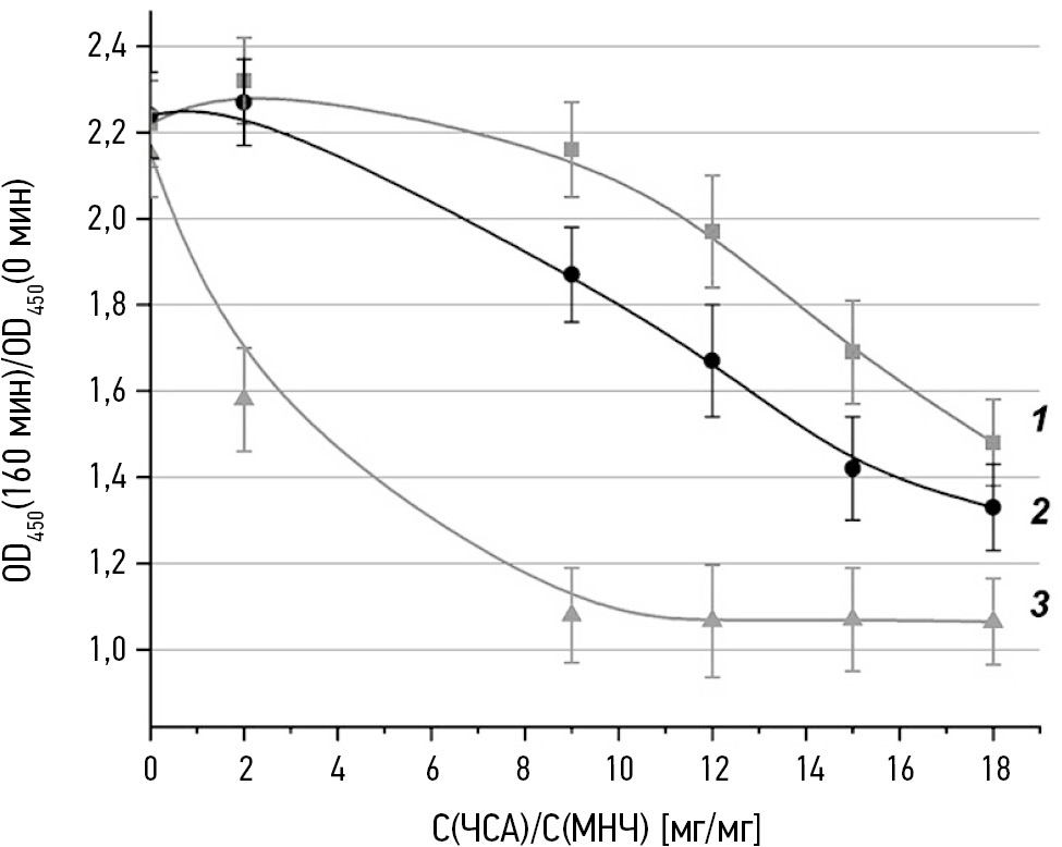 Fig. 3. Dependence of relative optical density on the ratio of magnetic nanoparticles (МНЧ) and human serum albumin (ЧСА) concentrations in the reaction systems after immunoglobulin G addition. Incubation time of the systems before addition of immunoglobulin G: 1 — 30 minutes, 2 — 90 minutes, 3 — 24 hours.