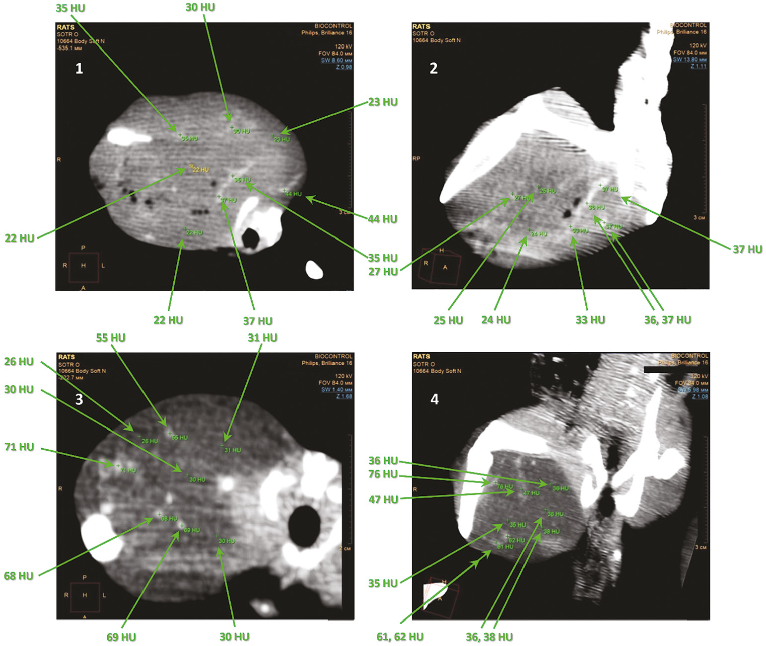 Рис. 4. КТ-исследование опухолевого узла под двумя разными углами (в поперечной и сагиттальной плоскостях) в бедренной мышце крысы через 30 мин (1, 2) и 14 дней (3, 4) после введения наносистем на основе магнитных наночастиц и человеческого сывороточного альбумина (в количестве 60 мкг по магнитным наночастицам).