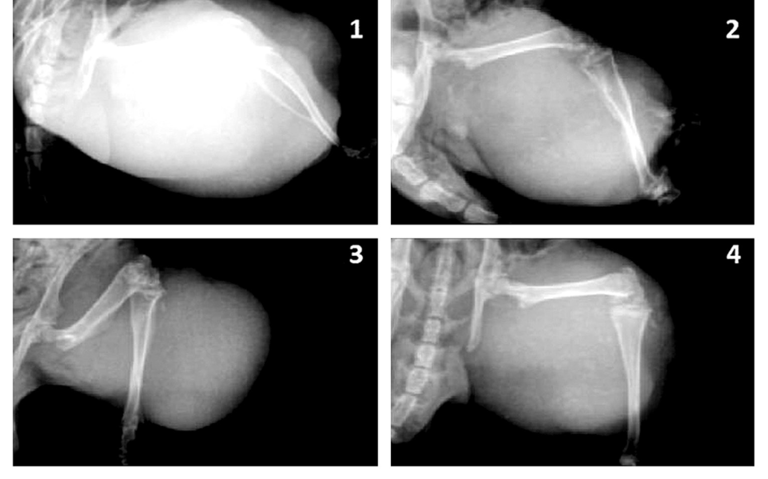 Рис. 5. Рентгенологическое исследование через 30 мин после введения наносистем на основе магнитных наночастиц и человеческого сывороточного альбумина в количестве 40 мкг по магнитным наночастицам (1) и через 14 дней после введения наносистем в количестве 20 мкг (2), 40 мкг (3) и 60 мкг (4) по магнитным наночастицам.