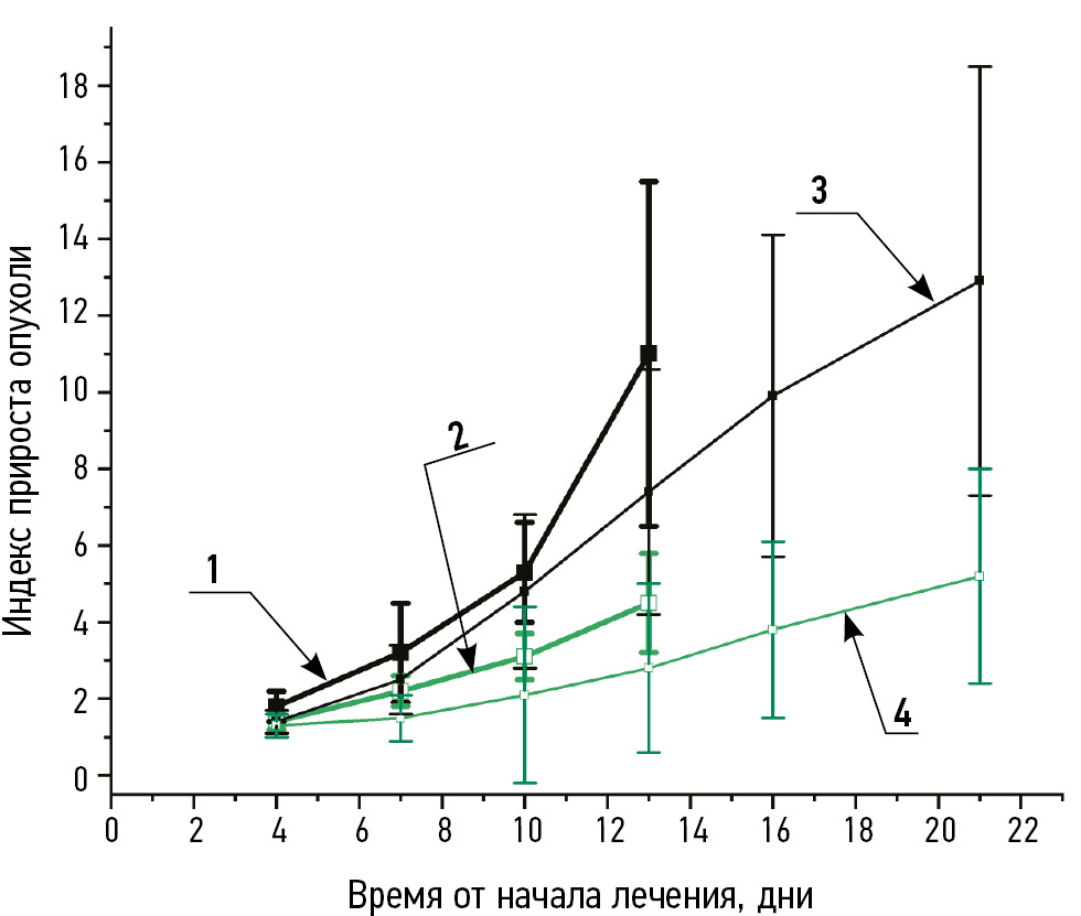 Рис. 7. Влияние наносистем на основе магнитных наночастиц и человеческого сывороточного альбумина, введённых в количестве 60 мкг (по массе магнитных наночастиц), на индекс прироста опухолей (ИПО), характеризуемых размерами в начале лечения Vcp=9,5–10,5 см3 (1, 2) и Vcp=6,0–6,5 см3 (3, 4).