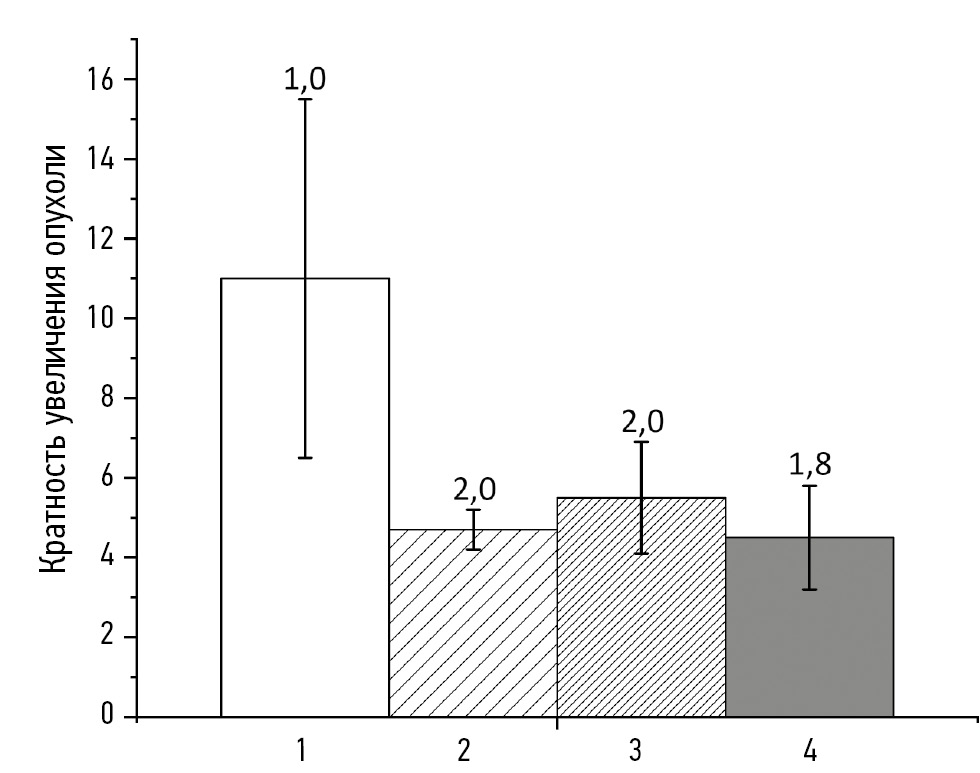 По соотношению Vt/V0 рассчитывали ИПО в группах. Также использовали характеристику τ — время удвоения объёма опухоли и К — коэффициент эффективности лечения в сравнении с группой контроля роста опухоли, рассчитываемый как соотношение (τ опыта) / (τ контроля).