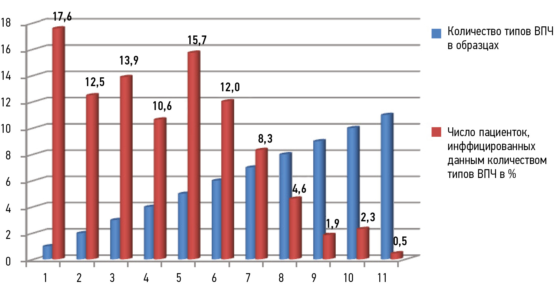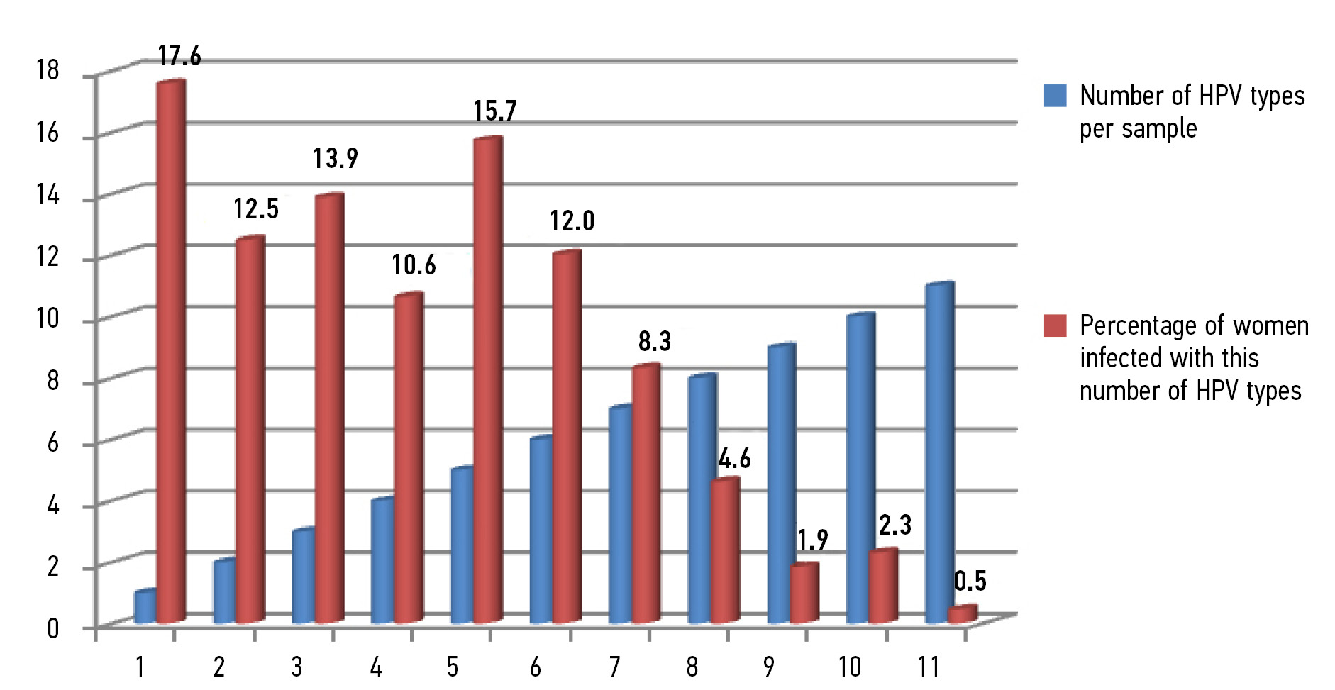 Рис. 1. Количество типов вируса папилломы человека, выявленных одновременно у женщин из Республики Башкортостан.