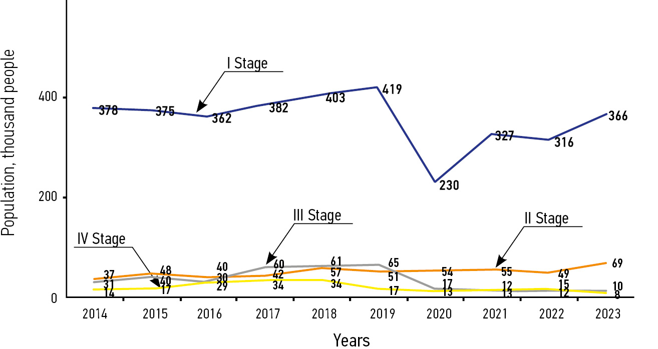 Fig. 2. Dynamics of thyroid cancer case distribution by stage in Altai krai, 2014–2023.