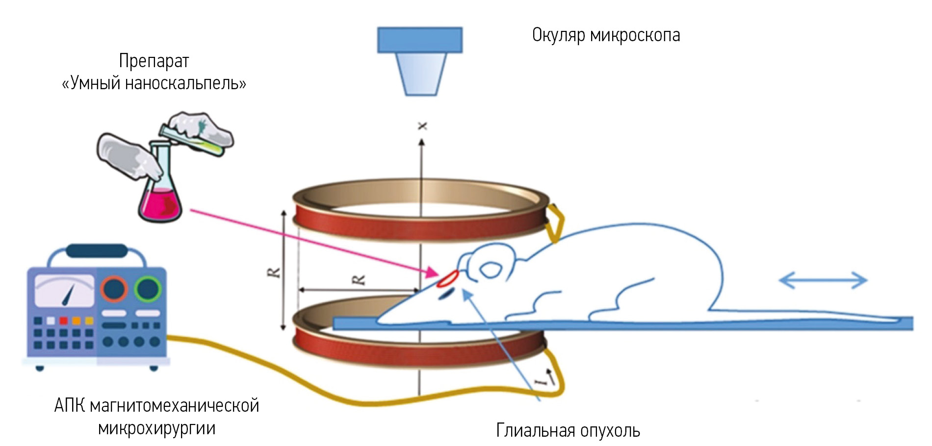 Рис. 2. Микрохирургия глиальной опухоли головного мозга с помощью магнитных нанодисков, дистанционно управляемых магнитным полем. АПК — аппаратно-программный комплекс.