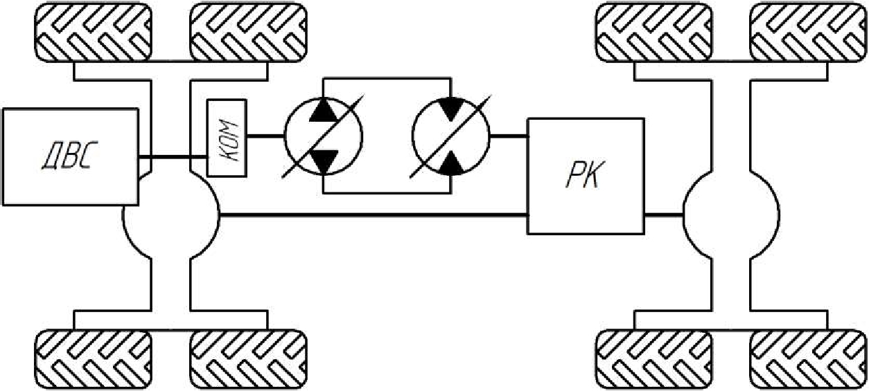 Схема трансмиссии представлена на рис. 2. Гидронасос ГОП через механическую передачу связан с двигателем внутреннего сгорания (ДВС). Выходной вал гидромотора входит в раздаточную коробку, которая, в свою очередь, соединена с ведущими мостами машины.