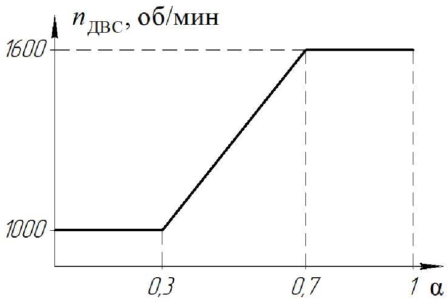 Управление ДВС осуществляется согласно зависимости частоты вращения коленчатого вала (рис. 3) от степени нажатия на педаль ускорения.