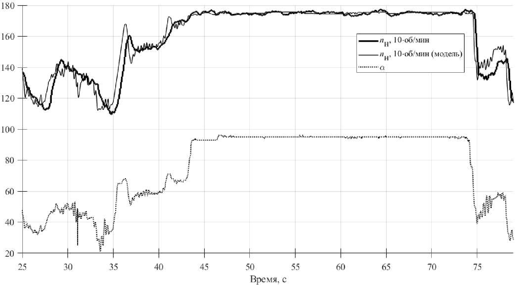 Рис. 9. Частота вращения вала гидронасоса и степень нажатия на педаль ускорения в натурном и вычислительном эксперименте