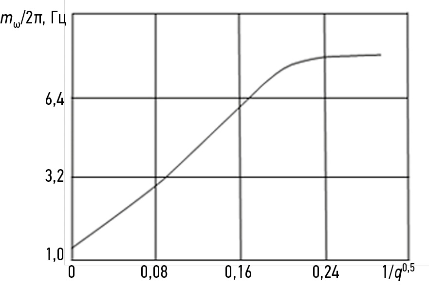 Рис. 2. Зависимость mω/2π от величины f (1/q0,5).